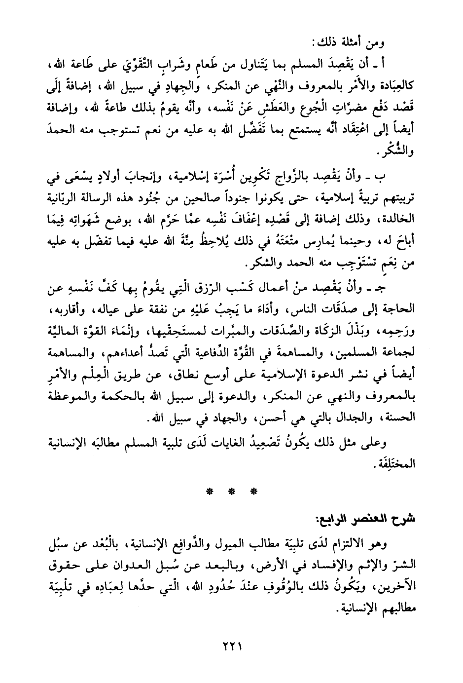 ج- وأن يقصد من أعمال كسب الرزق التي يقوم بها كف نفسه عن الحاجة إلى صدقات الناس، وأداء ما يجب عليه من نفقة على عياله, وأقاربه، ورحمه، وبذل الزكاة والصدقات والمبرات لمستحقيها، وإنما القوة المالية لجماعة المسلمين، والمساهمة في القوة الدفاعية التي تصد أعداءهم، والمساهمة أيضًا في نشر الدعوة الإسلامية على أوسع نطاق، عن طريق العلم والأمر بالمعروف والنهي عن المنكر، والدعوة إلى سبيل الله بالحكمة والموعظة الحسنة، والجدال بالتي هي أحسن، والجهاد في سبيل الله.