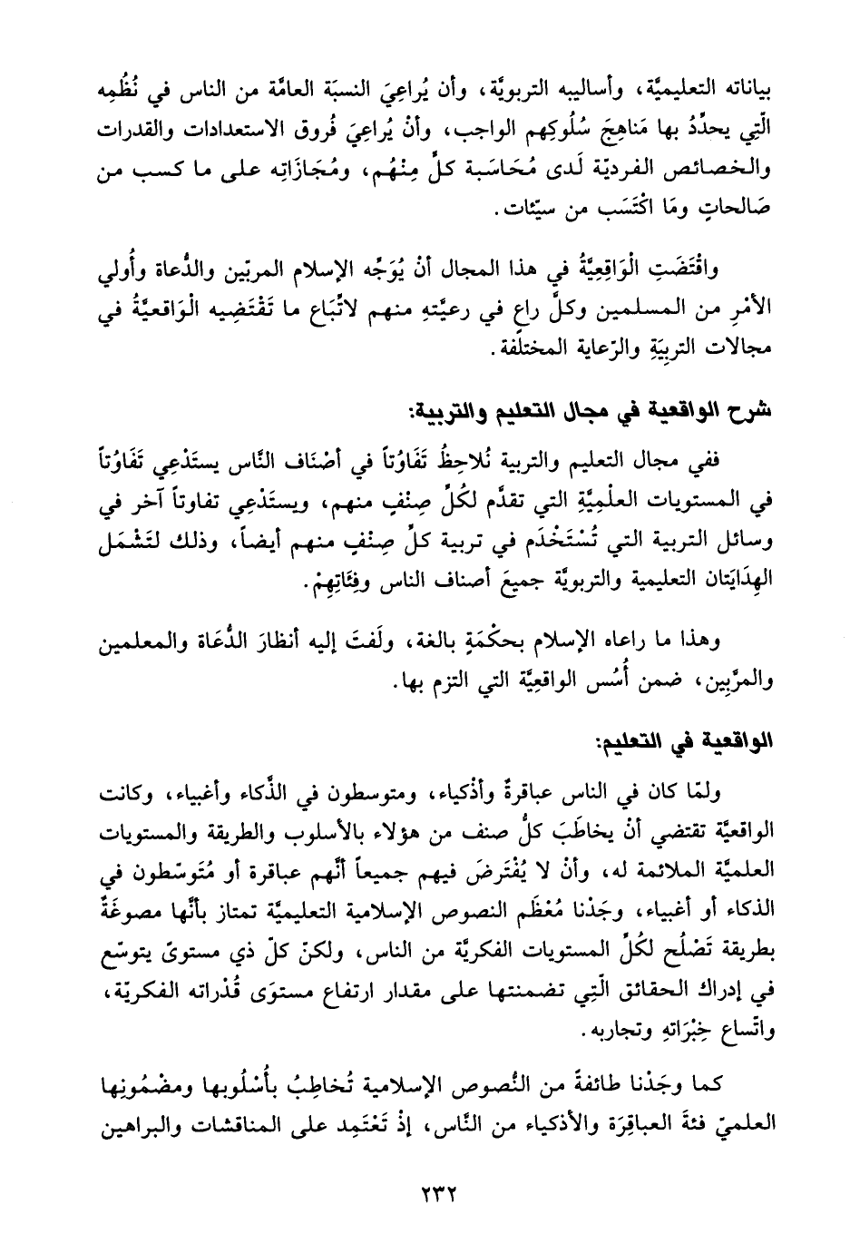 واقتضت الواقعية في هذا المجال أن يوجه الإسلام المربين والدعاة وأولي الأمر من المسلمين وكل راع في رعيته منهم لاتباع ما تقتضيه الواقعية في مجالات التربية والرعاية المختلفة.