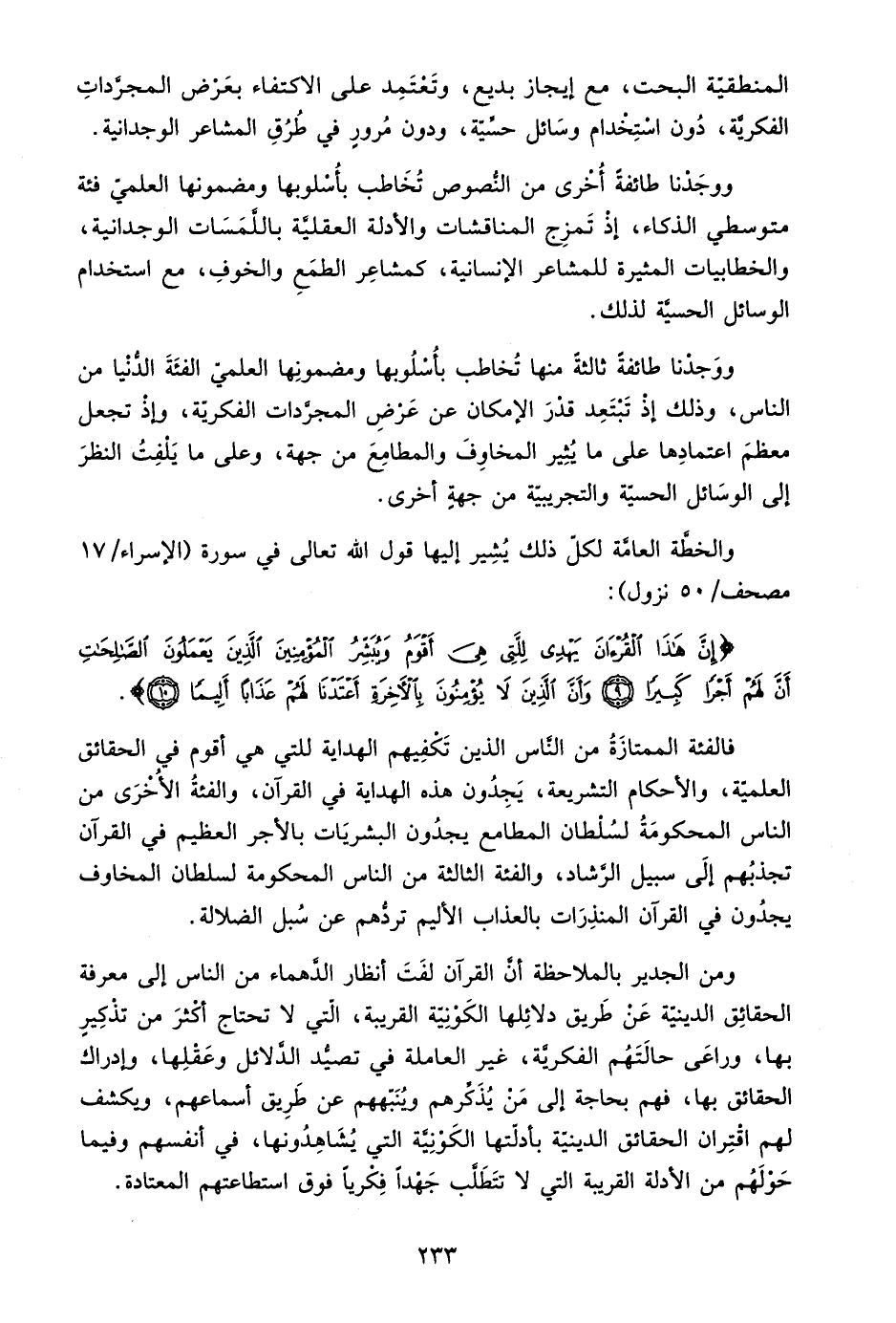 فالفئة الممتازة من الناس الذين تكفيهم الهداية للتي هي أقوم في الحقائق العلمية، والحكام الشرعية، يجدون هذه الهداية في القرآن، والفئة الأخرى من الناس المحكومة لسلطان المطامع يجدون البشريات بالأجر العظيم في القرآن تجذبهم إلى سبيل الرشاد، والفئة الثالثة من الناس المحكومة لسلطان المخاوف يجدون في القرآن المنذرات بالعذاب الأليم تردهم عن سبل الضلالة.