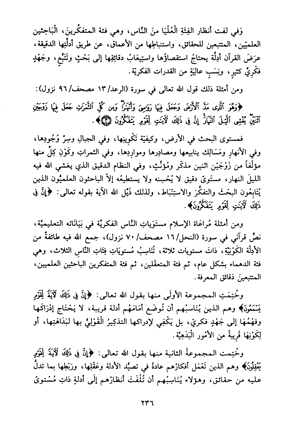 فمستوى البحث في الأرض، وكيفية تكوينها، وفي الجبال وسر وجودها، وفي الأنهار ومسالك ينابيعها ومصادرها ومواردها، وفي الثمرات وكون كل منها مؤلفًا من زوجين اثنين مذكر ومؤنث، وفي النظام الدقيق الذي يغشي الله فيه الليل النهار، مستوى دقيق لا يحسنه ولا يستطيعه إلا الباحثون العلميون الذين يتابعون البحث والتفكر والاستنباط، ولذلك ذيل الله الآية بقوله تعالى: {إِنَّ فِي ذَلِكَ لَآيَاتٍ لِقَوْمٍ يَتَفَكَّرُونَ} .