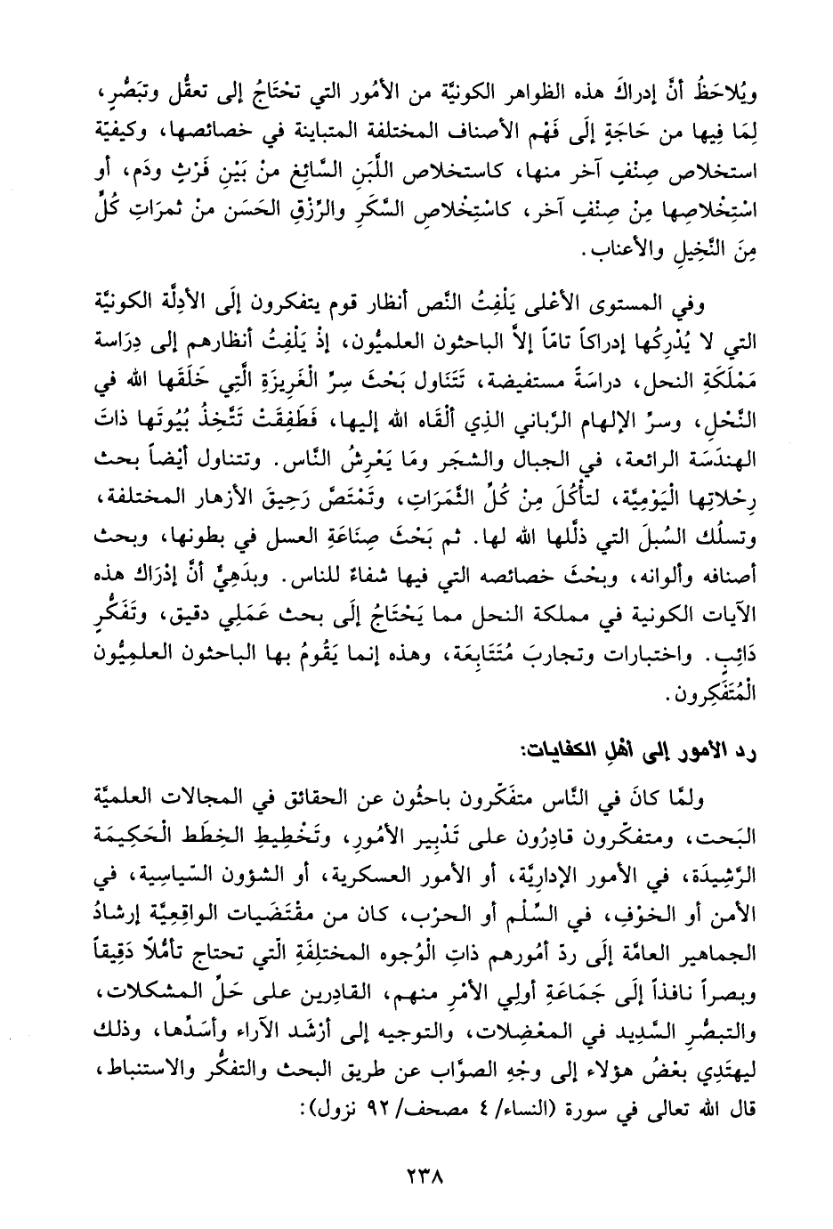 ولما كان في الناس متفكرون باحثون عن الحقائق في المجالات العلمية البحت، ومتفكرون قادرون على تدبير الأمور، وتخطيط الخطط الحكيمة الرشيدة، في الأمور الإدارية، أو الأمور العسكرية، أو الشئون السياسية، في الأمن أو الخوف، في السلم أو الحرب، كان من مقتضيات الواقعية إرشاد الجماهير العامة إلى رد أمورهم ذات الوجوه المختلفة التي تحتاج تأملًا دقيقًا وبصرًا نافذًا إلى جماعة أولي الأمر منهم، القادرين على حل المشكلات، والتبصر السديد في المعضلات، والتوجيه إلى أرشد الآراء وأسدها، وذلك ليهتدي بعض هؤلاء إلى وجه الصواب عن طريق البحث والتفكر والاستنباط، قال الله تعالى في سورة "النساء: 4 مصحف/ 92 نزول":