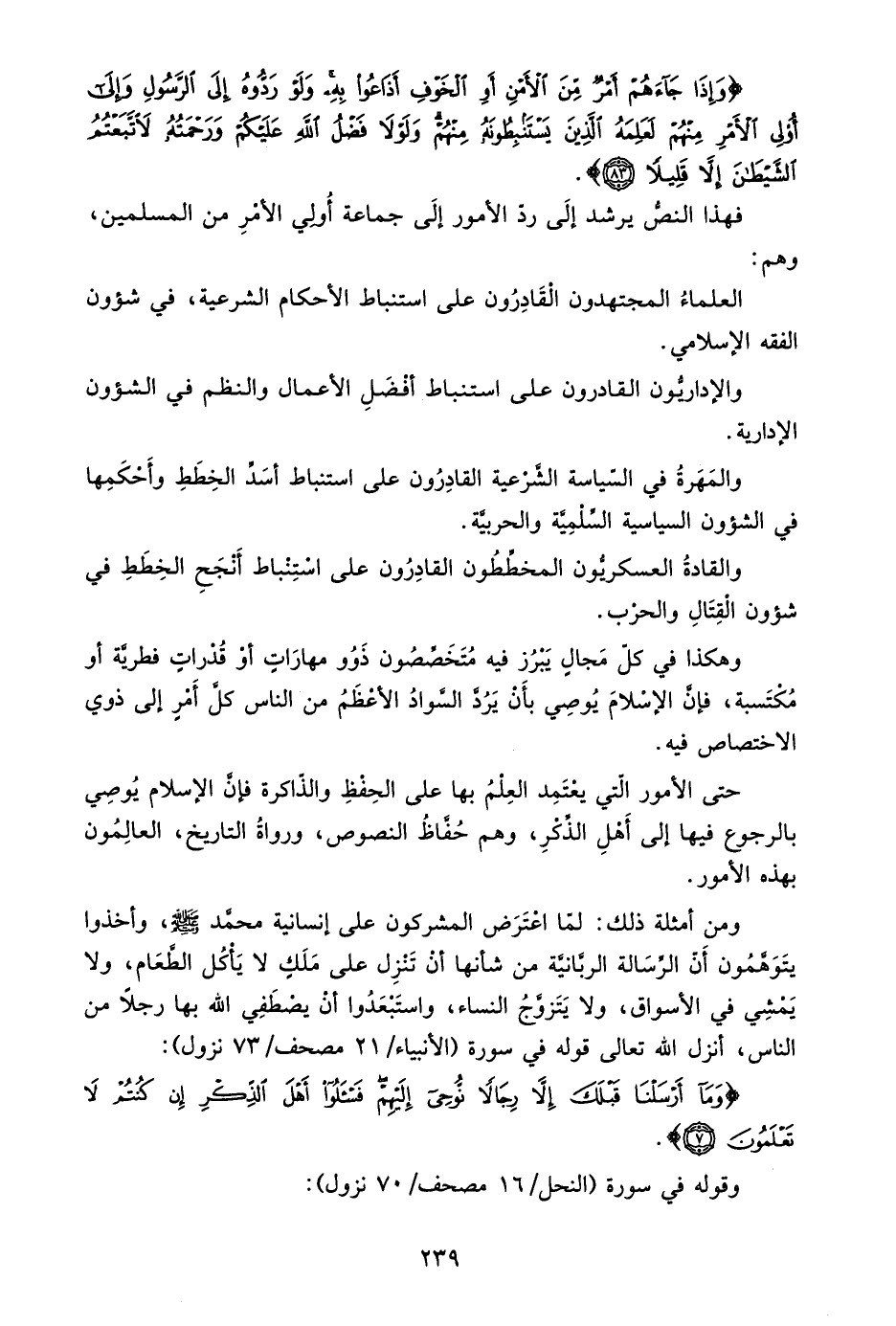 فهذا النص يرشد إلى رد الأمور إلى جماعة أولي الأمر من المسلمين وهم: