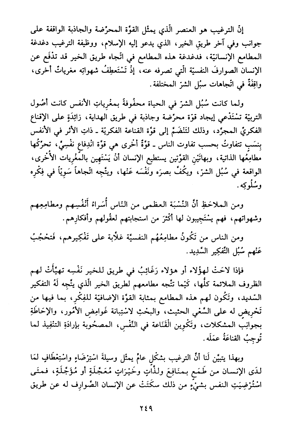 ولما كانت سبل الشر في الحياة محفوفة بمغريات الأنفس كانت أصول التربية تستدعي إيجاد قوة محرضة وجاذبة في طريق الهداية، زائدة على الإقناع الفكري المجرد، وذلك لتنضم إلى قوة القناعة الفكرية -ذات الأثر في الأنفس بنسب تتفاوت بحسب تفاوت الناس- قوة أخرى هي قوة اندفاع نفسي، تحركها مطامعها الذاتية، وبهاتين القوتين يستطيع الإنسان أن يستهين بالمغريات الأخرى، الواقعة في سبل الشر، ويكف بصره ونفسه عنها، ويتجه اتجاهًا سويًّا في فكره وسلوكه.