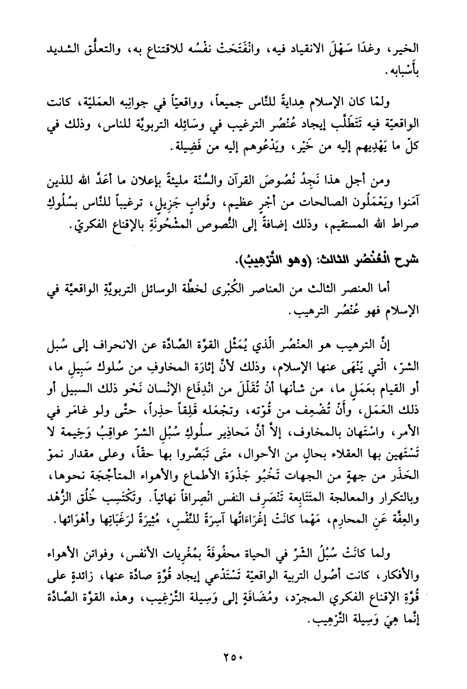 أما العنصر الثالث من العناصر الكبرى لخطة الوسائل التربوية الواقعية في الإسلام فهو عنصر الترهيب.