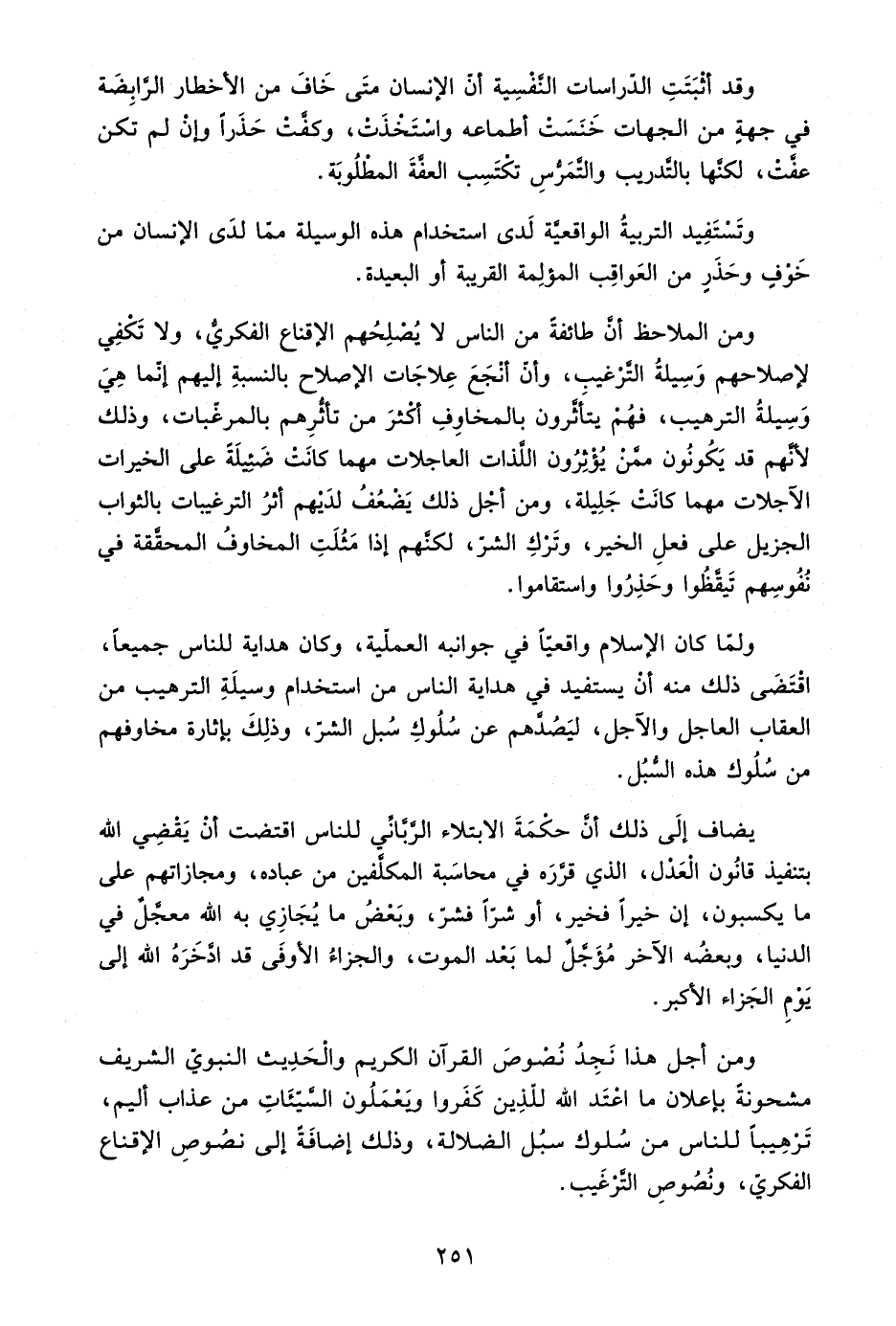 ومن أجل هذا نجد نصوص القرآن الكريم والحديث النبوي الشريف مشحونة بإعلان ما اعتد الله للذين كفروا ويعملون السيئات من عذاب أليم، ترهيبًا للناس من سلوك سبل الضلالة، وذلك إضافة إلى نصوص الإقناع الفكري، ونصوص الترغيب.