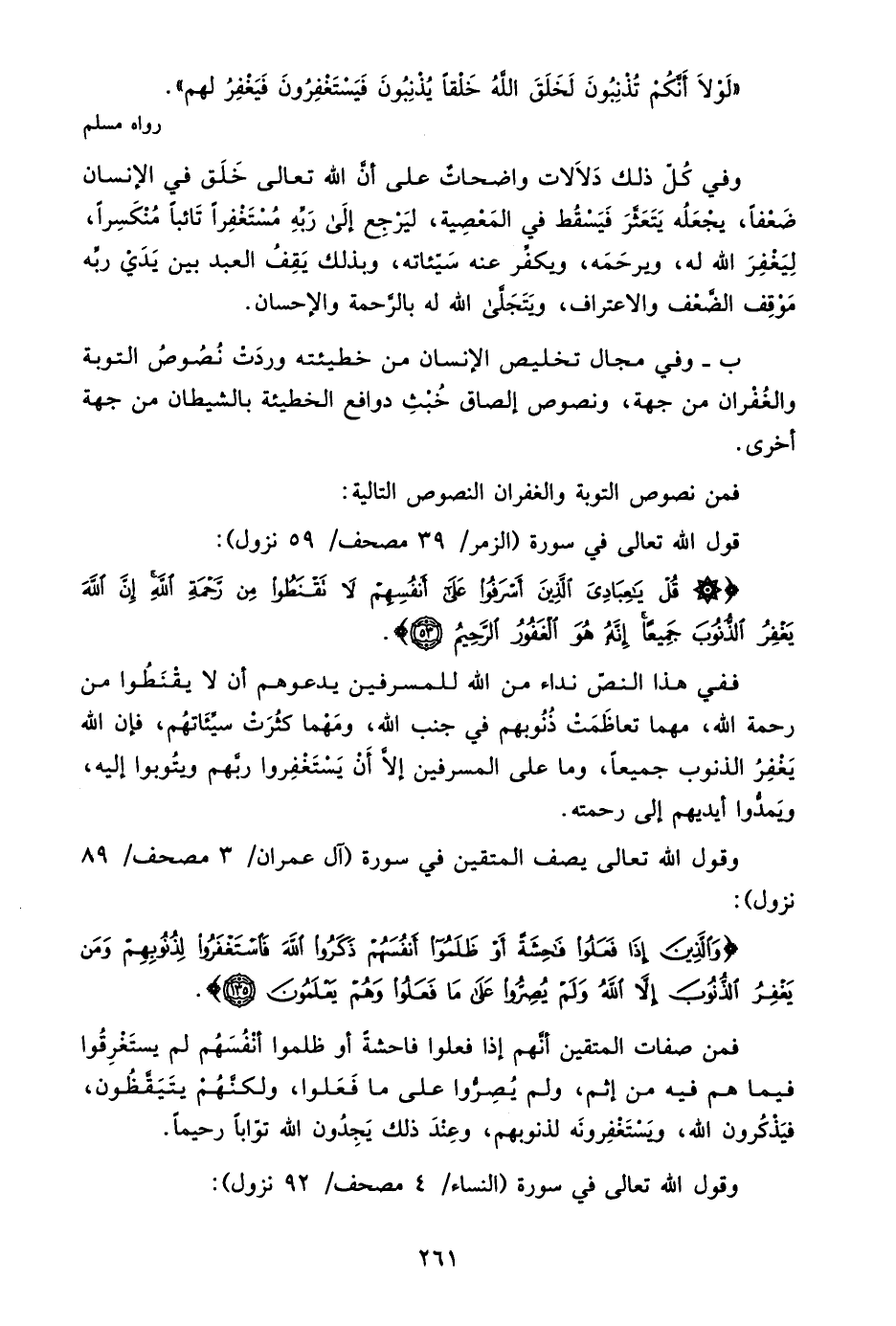 {وَالَّذِينَ إِذَا فَعَلُوا فَاحِشَةً أَوْ ظَلَمُوا أَنْفُسَهُمْ ذَكَرُوا اللَّهَ فَاسْتَغْفَرُوا لِذُنُوبِهِمْ وَمَنْ يَغْفِرُ الذُّنُوبَ إِلَّا اللَّهُ وَلَمْ يُصِرُّوا عَلَى مَا فَعَلُوا وَهُمْ يَعْلَمُونَ} .