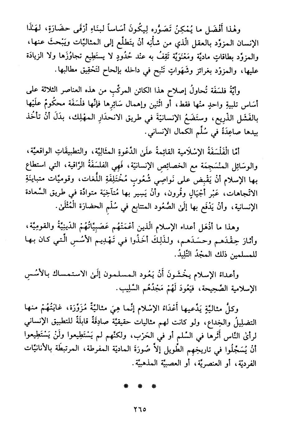 أما الفلسفة الإسلامية القائمة على الدعوة المثالية، والتطبيقات الواقعية، والوسائل المنسجمة مع الخصائص الإنسانية، فهي الفلسفة الراقية، التي استطاع بها الإسلام أن يقبض على نواصي شعوب مختلفة اللغات، وقوميات متباينة الاتجاهات، عن أجيال وقرون، وأن يسير بها متآخية متوادة في طريق السعادة الإنسانية، وأن يدفع بها إلى الصعود المتتابع في سلم الحضارة المثلى.