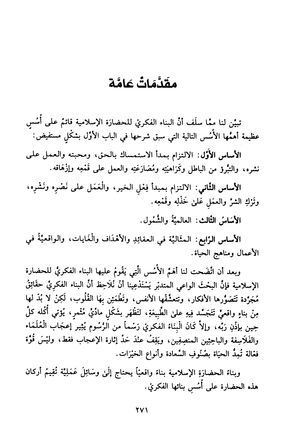 تبين لنا مما سلف أن البناء الفكري للحضارة الإسلامية قائم على أسس عظيمة أهمها الأسس التالية التي سبق شرحها في الباب الأول بشكل مستفيض: