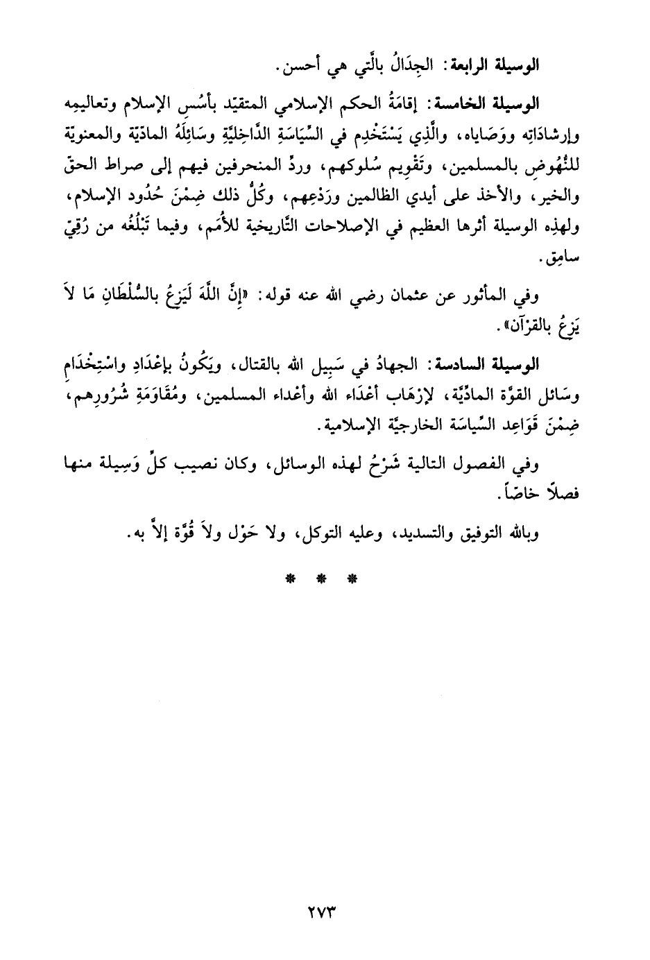 الوسيلة السادسة: الجهاد في سبيل الله بالقتال، ويكون بإعداد واستخدام وسائل القوة المادية؛ لإرهاب أعداء الله وأعداء المسلمين، ومقاومة شرورهم، ضمن قواعد السياسة الخارجية الإسلامية.