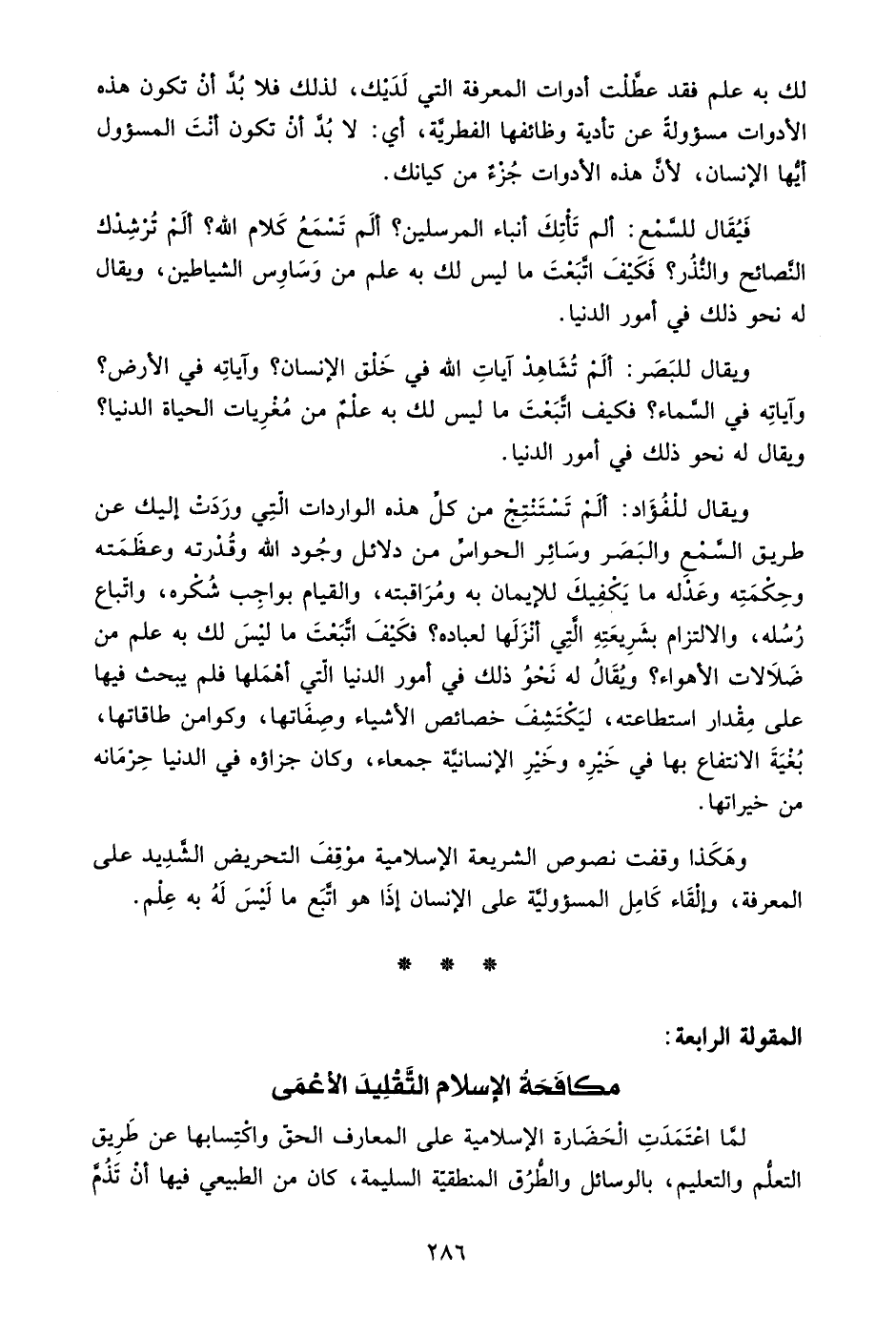 وهكذا وقفت نصوص الشريعة الإسلامية موقف التحريض الشديد على المعرفة، وإلقاء كامل المسئولية على الإنسان إذا هو اتبع ما ليس له به علم.