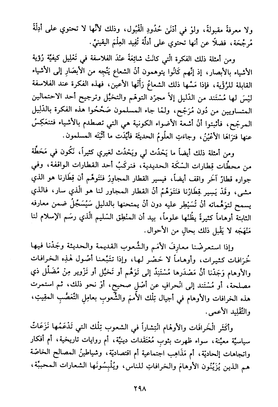 ومن أمثلة ذلك أيضًا ما يحدث لي ويحدث لغيري كثيرًا، نكون في محطة من محطات قطارات السكة الحديدية، فنركب أحد القطارات الواقفة، وفي جواره قطار آخر واقف أيضًا، فيسير القطار المجاور فنتوهم أن قطارنا هو الذي مشى، وقد يسير قطارنا فنتوهم أن القطار المجاور لنا هو الذي سار، فالذي يسمح لتوهماته أن تسيطر عليه دون أن يمتحنها بالدليل سيسجل ضمن معارفه الثابتة أوهامًا كثيرة يظنها علومًا، بيد أن المنطق السليم الذي رسم الإسلام لنا منهجه لا يقبل ذلك بحال من الأحوال.