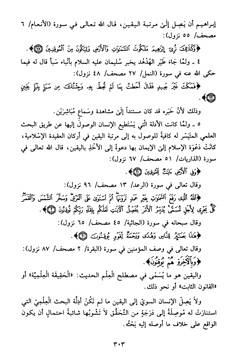 5- ولما كانت الأدلة التي يستطيع الإنسان الوصول إليها عن طريق البحث العلمي المتيسر له كافية للوصول به إلى مرتبة اليقين في أركان العقيدة الإسلامية، كانت دعوة الإسلام إلى الإيمان بها دعوة إلى الأخذ باليقين، قال الله تعالى في سورة "الذاريات: 51 مصحف/ 67 نزول":