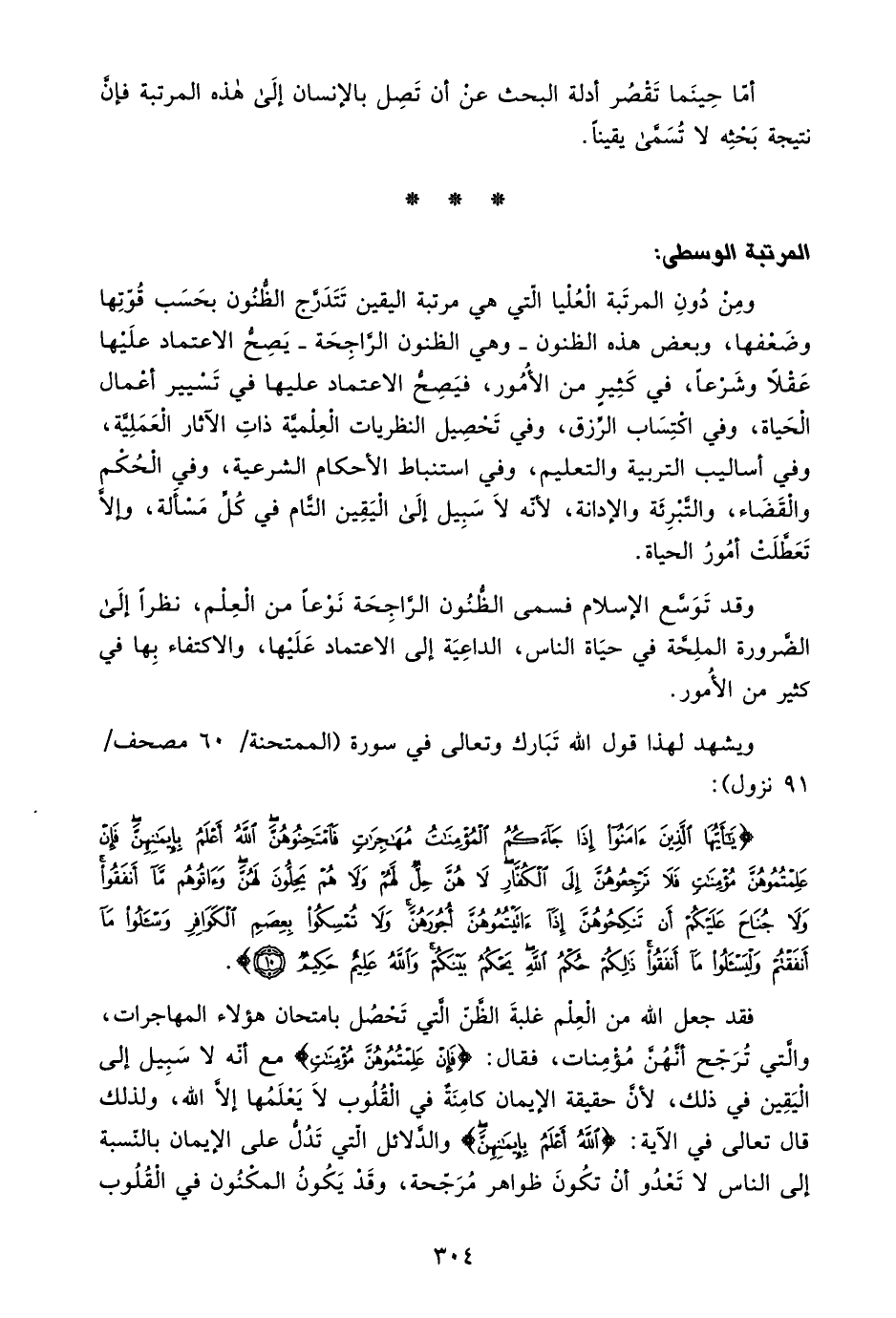 ومن دون المرتبة العليا التي هي مرتبة اليقين تتدرج الظنون بحسب قوتها وضعفها، وبعض هذه الظنون -وهي الظنون الراجحة- يصح الاعتماد عليها عقلًا وشرعًا، في كثير من الأمور، فيصح الاعتماد عليها في تسيير أعمال الحياة، وفي اكتساب الرزق، وفي تحصيل النظريات العلمية ذات الآثار العملية، وفي أساليب التربية والتعليم، وفي استنباط الأحكام الشرعية، وفي الحكم والقضاء، والتبرئة والإدانة؛ لأنه لا سبيل إلى اليقين التام في كل مسألة، وإلا تعطلت أمور الحياة.