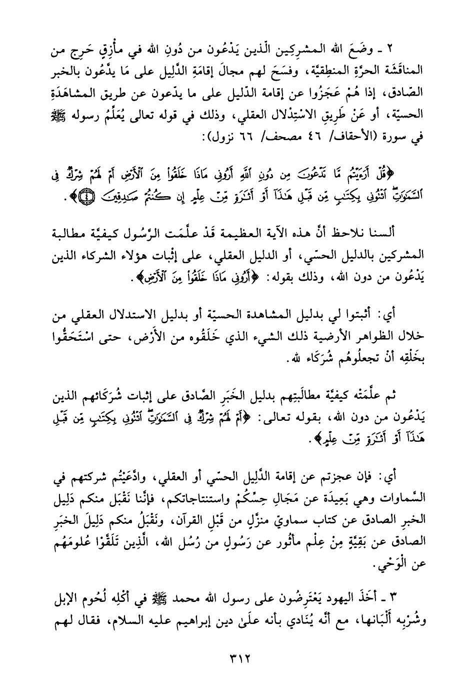 {قُلْ أَرَأَيْتُمْ مَا تَدْعُونَ مِنْ دُونِ اللَّهِ أَرُونِي مَاذَا خَلَقُوا مِنَ الْأَرْضِ أَمْ لَهُمْ شِرْكٌ فِي السَّمَاوَاتِ اِئْتُونِي بِكِتَابٍ مِنْ قَبْلِ هَذَا أَوْ أَثَارَةٍ مِنْ عِلْمٍ إِنْ كُنْتُمْ صَادِقِينَ} .