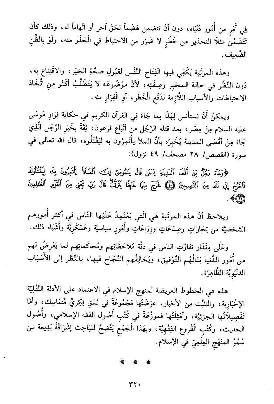 هذه هي الخطوط العريضة لمنهج الإسلام في الاعتماد على الأدلة النقلية الإخبارية، والتثبت من الأخبار، عرضتها مجموعة في نسق فكري متماسك، وأما تفصيلاتها الجزئية، وأمثلتها فموزعة في كتب أصول الفقه الإسلامي، وأصول الحديث، وكتب الفروع الفقهية، وبهذا الجمع يتضح للباحث إشراقة بديعة من سمو المنهج العلمي في الإسلام.