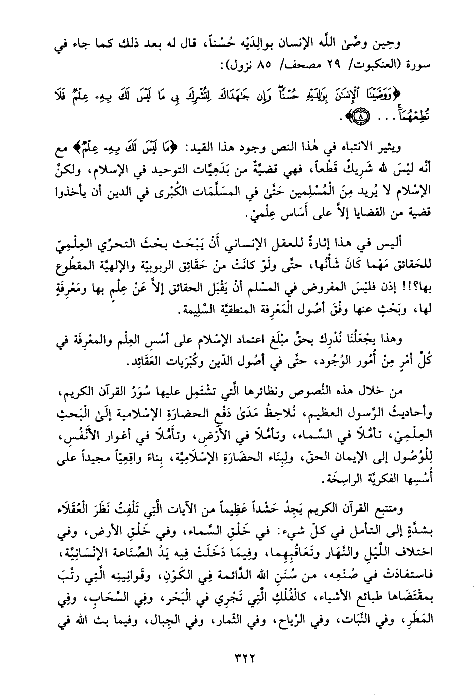 ويثير الانتباه في هذا النص وجود هذا القيد: {مَا لَيْسَ لَكُمْ بِهِ عِلْمٌ} مع أنه ليس لله شريك قطعًا، فهي قضية من بدهيات التوحيد في الإسلام، ولكن الإسلام لا يريد من المسلمين حتى في المسلمات الكبرى في الدين أن يأخذوا قضية من القضايا إلا على أساس علمي.