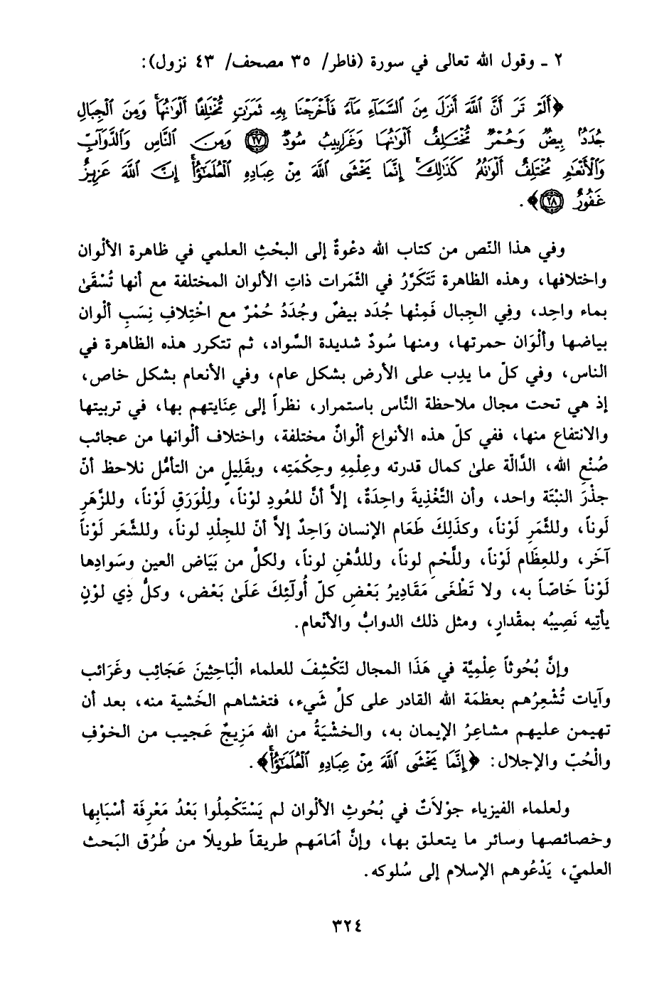 {أَلَمْ تَرَ أَنَّ اللَّهَ أَنْزَلَ مِنَ السَّمَاءِ مَاءً فَأَخْرَجْنَا بِهِ ثَمَرَاتٍ مُخْتَلِفًا أَلْوَانُهَا وَمِنَ الْجِبَالِ جُدَدٌ بِيضٌ وَحُمْرٌ مُخْتَلِفٌ أَلْوَانُهَا وَغَرَابِيبُ سُودٌ، وَمِنَ النَّاسِ وَالدَّوَابِّ وَالْأَنْعَامِ مُخْتَلِفٌ أَلْوَانُهُ كَذَلِكَ إِنَّمَا يَخْشَى اللَّهَ مِنْ عِبَادِهِ الْعُلَمَاءُ إِنَّ اللَّهَ عَزِيزٌ غَفُورٌ} .
