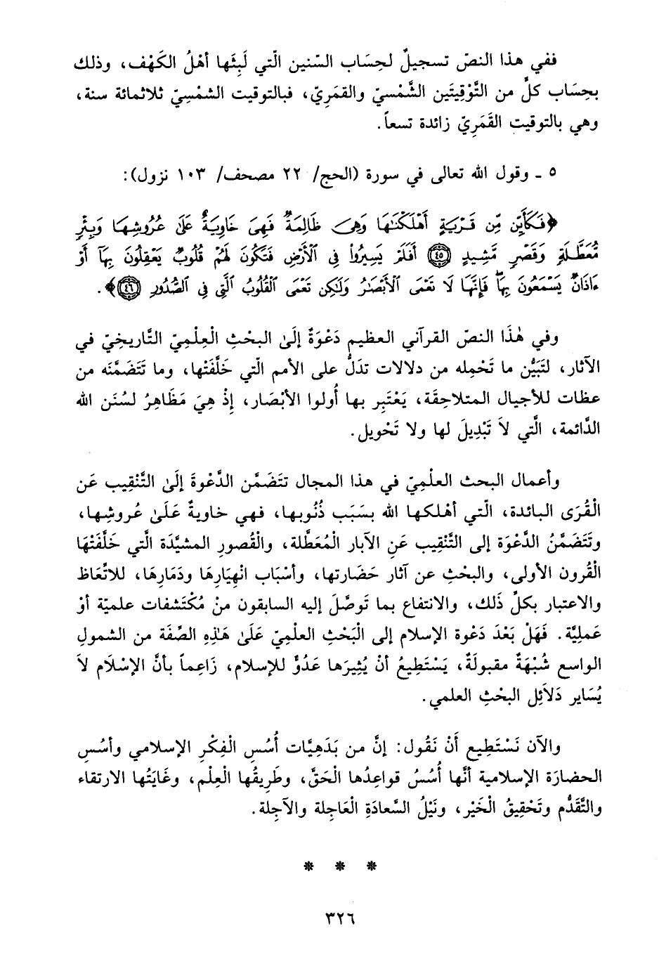 وأعمال البحث العلمي في هذا المجال تتضمن الدعوة إلى التنقيب عن القرى البائدة التي أهلكها الله بسبب ذنوبها، فهي خاوية على عروشها، وتتضمن الدعوة إلى التنقيب عن الآبار المعطلة والقصور المشيدة التي خلفتها القرون الأولى، والبحث عن آثار حضارتها، وأسباب انهيارها ودمارها، للاتعاظ والاعتبار بكل ذلك، والانتفاع بما توصل إليه السابقون من مكتشفات علمية أو عملية. فهل بعد دعوة الإسلام إلى البحث العلمي على هذه الصفة من الشمول الواسع شبهة مقبولة، يستطيع أن يثيرها عدو للإسلام، زاعمًا بأن الإسلام لا يساير دلائل البحث العلمي.
