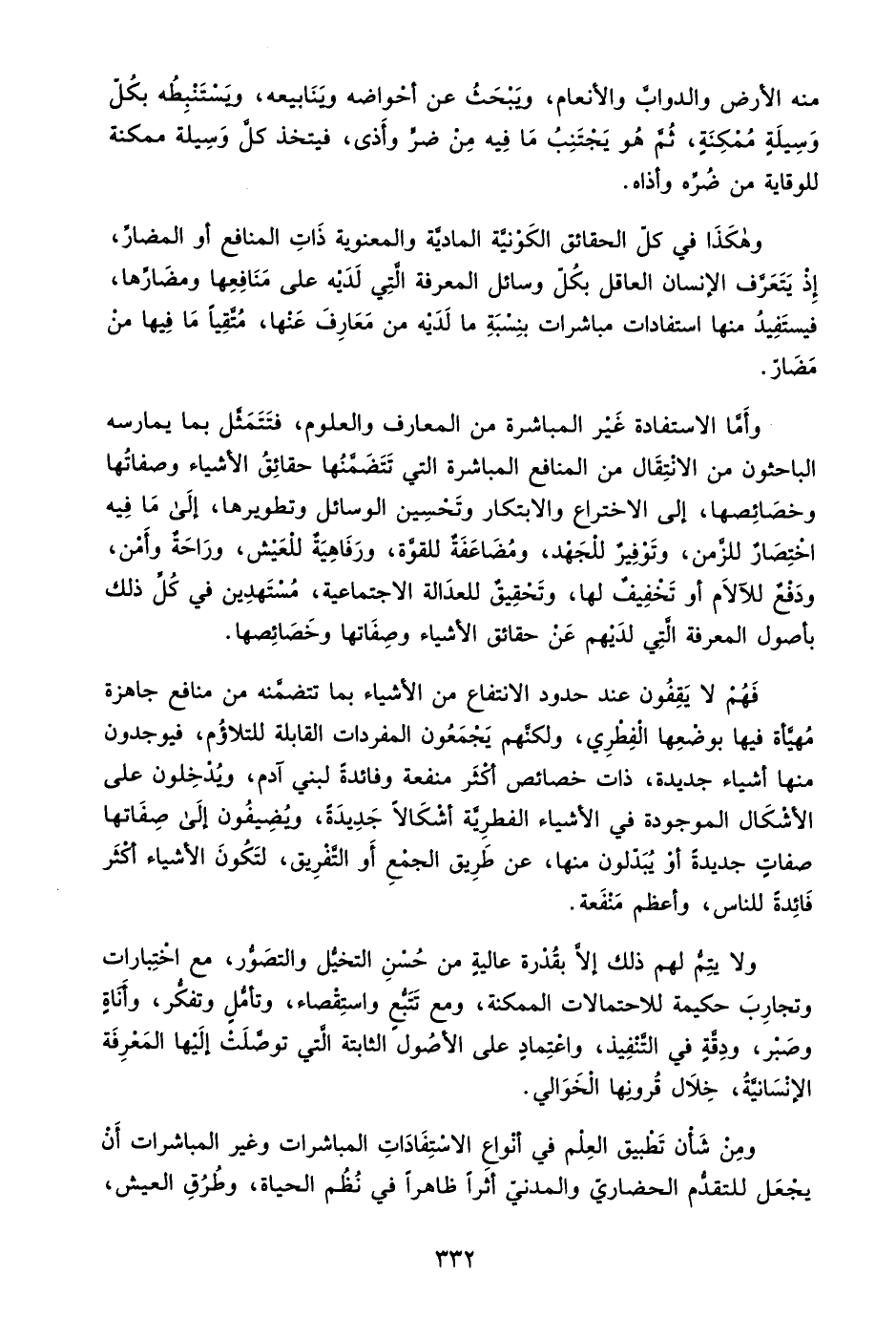 ومن شأن تطبيق العلم في أنواع الاستفادات المباشرات وغير المباشرات أن يجعل للتقدم الحضاري والمدني أثرًا ظاهرًا في نظم الحياة، وطرق العيش، والعلاقات الاجتماعية، وأثرًا ظاهرًا في العمران والزراعة، والصناعة والصحة والطب، ووسائل الرفاهية والقوة، إلى غير ذلك مما تحتوي عليه المدنيات الراقيات، من كل ما فيه خير الإنسانية أفرادًا وجماعات.