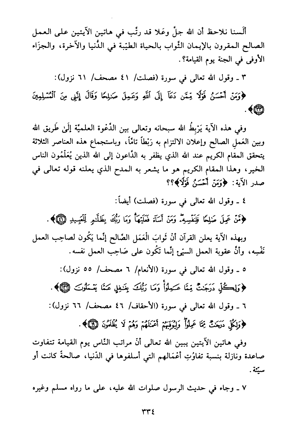 وفي هذه الآية يربط الله سبحانه وتعالى بين الدعوة العلمية إلى طريق الله وبين العمل الصالح وإعلان الالتزام به ربطًا تامًّا، وباستجماع هذه العناصر الثلاثة يتحقق المقام الكريم عند الله الذي يظفر به الداعون إلى الله الذين يعلمون الناس الخير، وهذا المقام الكريم هو ما يشعر به المدح الذي يعلنه قوله تعالى في صدر الآية: {وَمَنْ أَحْسَنُ قَوْلًا} .