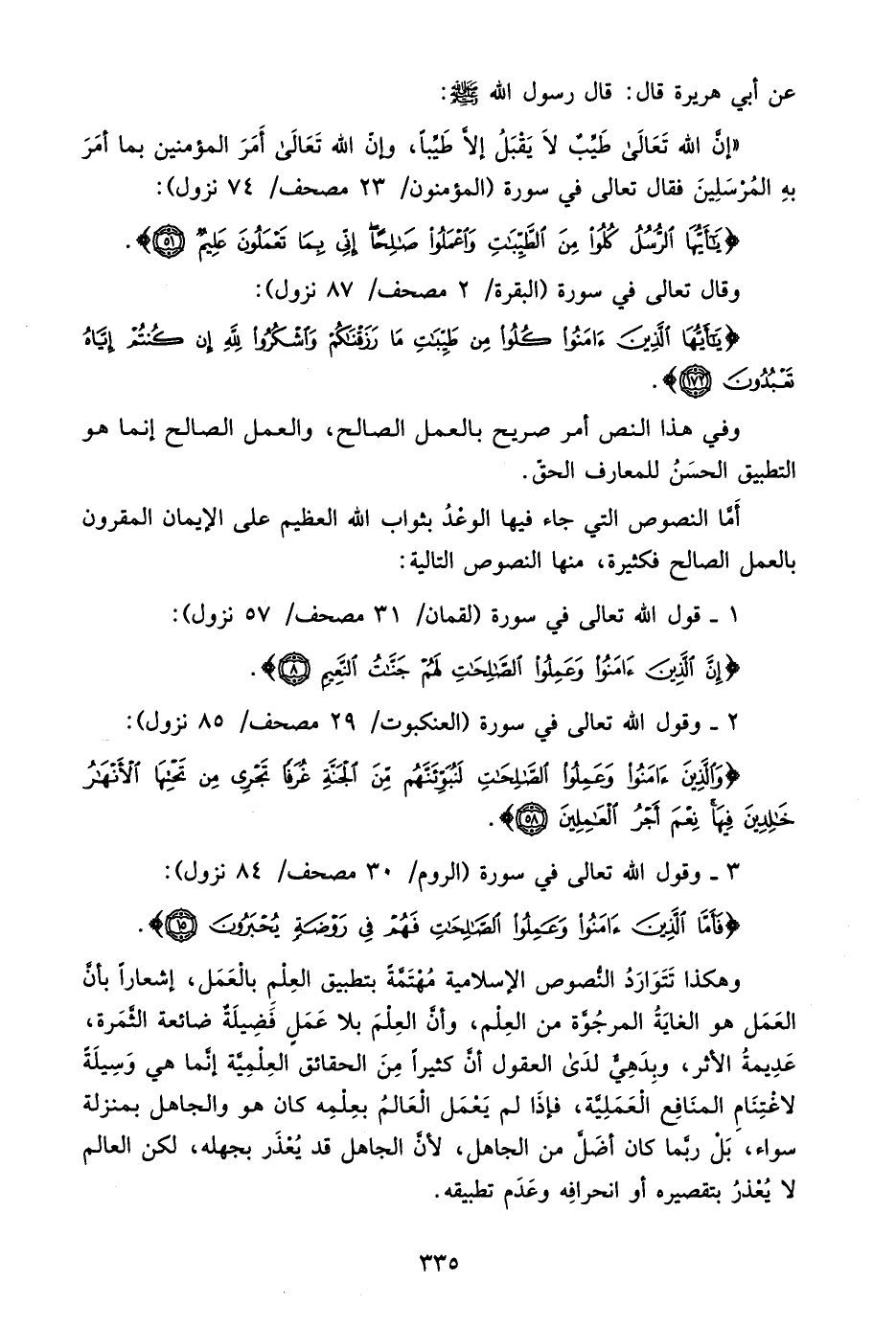 وفي هذا النص أمر صريح بالعمل الصالح، والعمل الصالح إنما هو التطبيق الحسن للمعارف الحق.