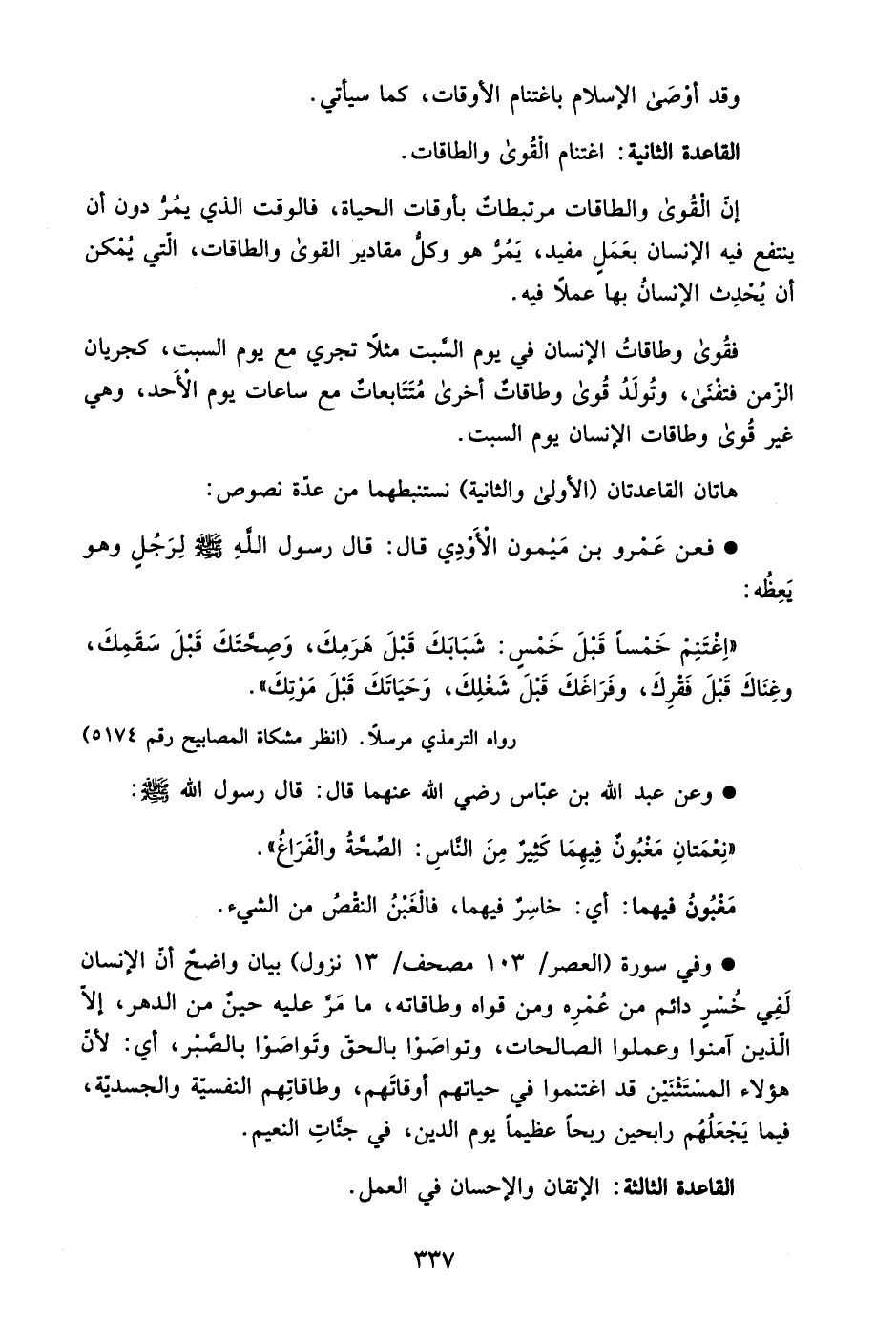إن القوى والطاقات مرتبطات بأوقات الحياة، فالوقت الذي يمر دون أن ينتفع فيه الإنسان بعمل مفيد، يمر هو وكل مقادير القوى والطاقات التي يمكن أن يحدث الإنسان بها عملًا فيه.
