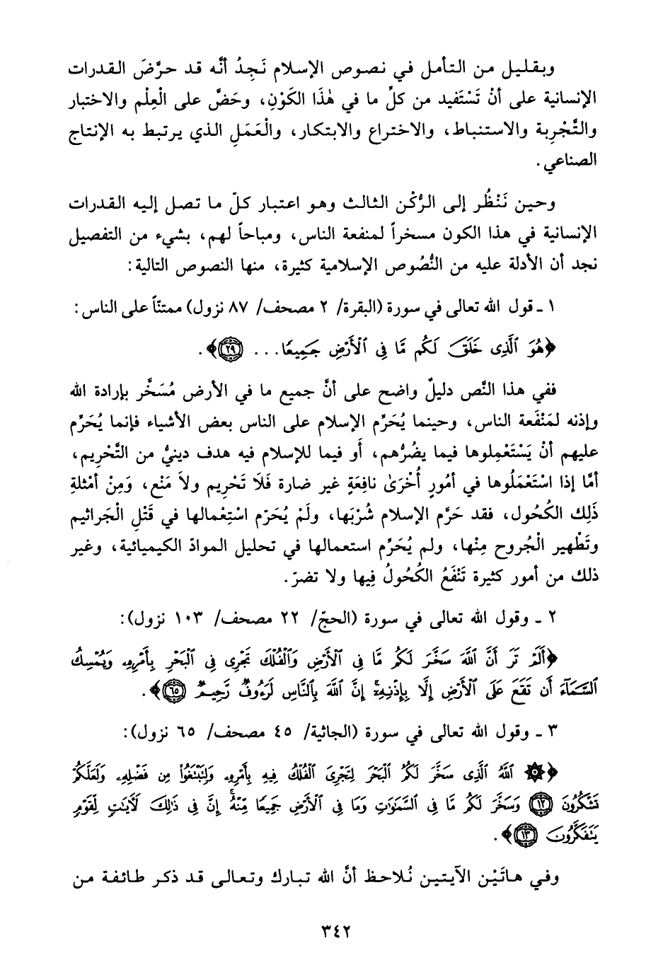 ففي هذا النص دليل واضح على أن جميع ما في الأرض مسخر بإرادة الله وإذنه لمنفعة الناس، وحينما يُحرم الإسلام على الناس بعض الأشياء فإنما يُحرم عليهم أن يستعملوها فيما يضرهم، أو فيما للإسلام فيه هدف ديني من التحريم، أما إذا استعملوها في أمور أخرى نافعة غير ضارة فلا تحريم ولا منع، ومن أمثلة ذلك الكحول، فقد حرم الإسلام شربها، ولم يحرم استعمالها في قتل الجراثيم وتطهير الجروح منها، ولم يحرم استعمالها في تحليل المواد الكيميائية، وغير ذلك من أمور كثيرة تنفع الكحول فيها ولا تضر.
