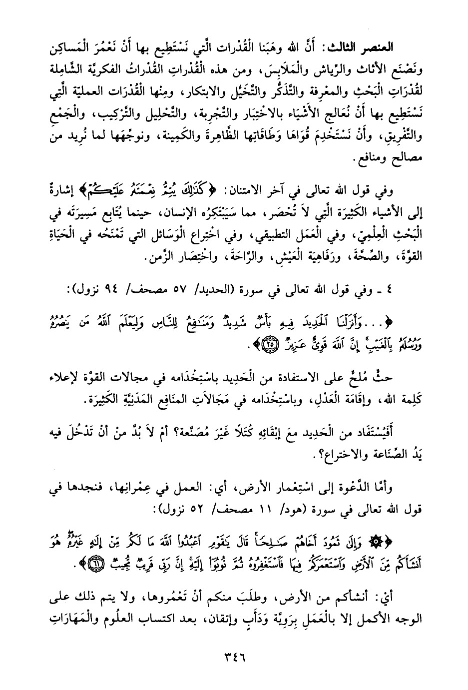 العنصر الثالث: أن الله وهبنا القدرات التي نستطيع بها أن نعمر المساكن ونصنع الأثاث والرياش والملابس، من هذه القدرات الفكرية الشاملة لقدرات البحث والمعرفة والتذكر والتخيل والابتكار، ومنها القدرات العملية التي نستطيع بها أن نعالج الأشياء بالاختبار والتجربة، والتحليل والتركيب، والجمع والتفريق، وأن تستخدم قواها وطاقاتها الظاهرة والكمينة، ونوجهها لما نريد من مصالح ومنافع.