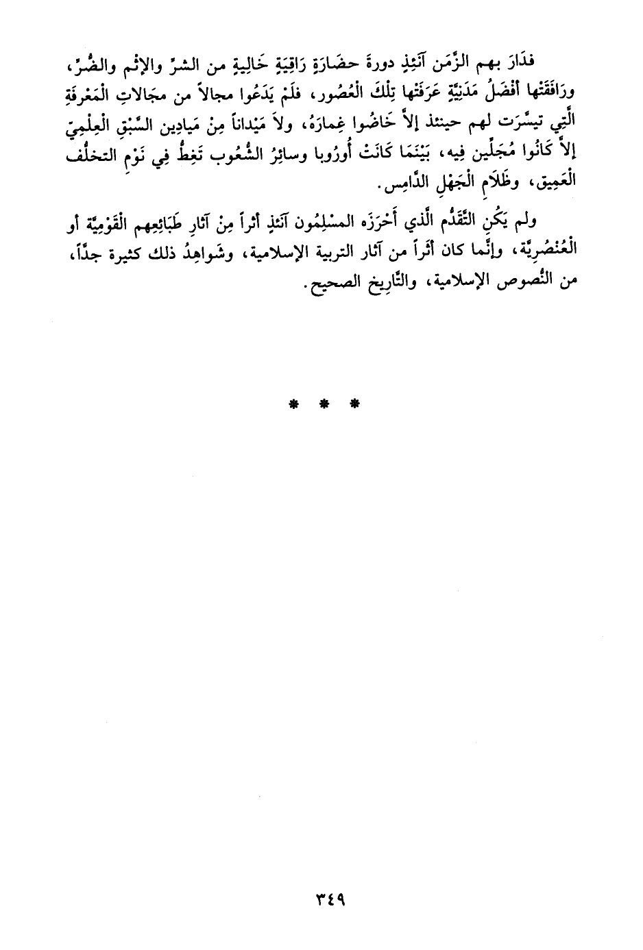 ولم يكن التقدم الذي أحرزه المسلمون آنئذ أثرًا من آثار طبائعهم القومية أو العنصرية، وإنما كان أثرًا من آثار التربية الإسلامية، وشواهد ذلك كثيرة جدًّا، من النصوص الإسلامية، والتاريخ الصحيح.