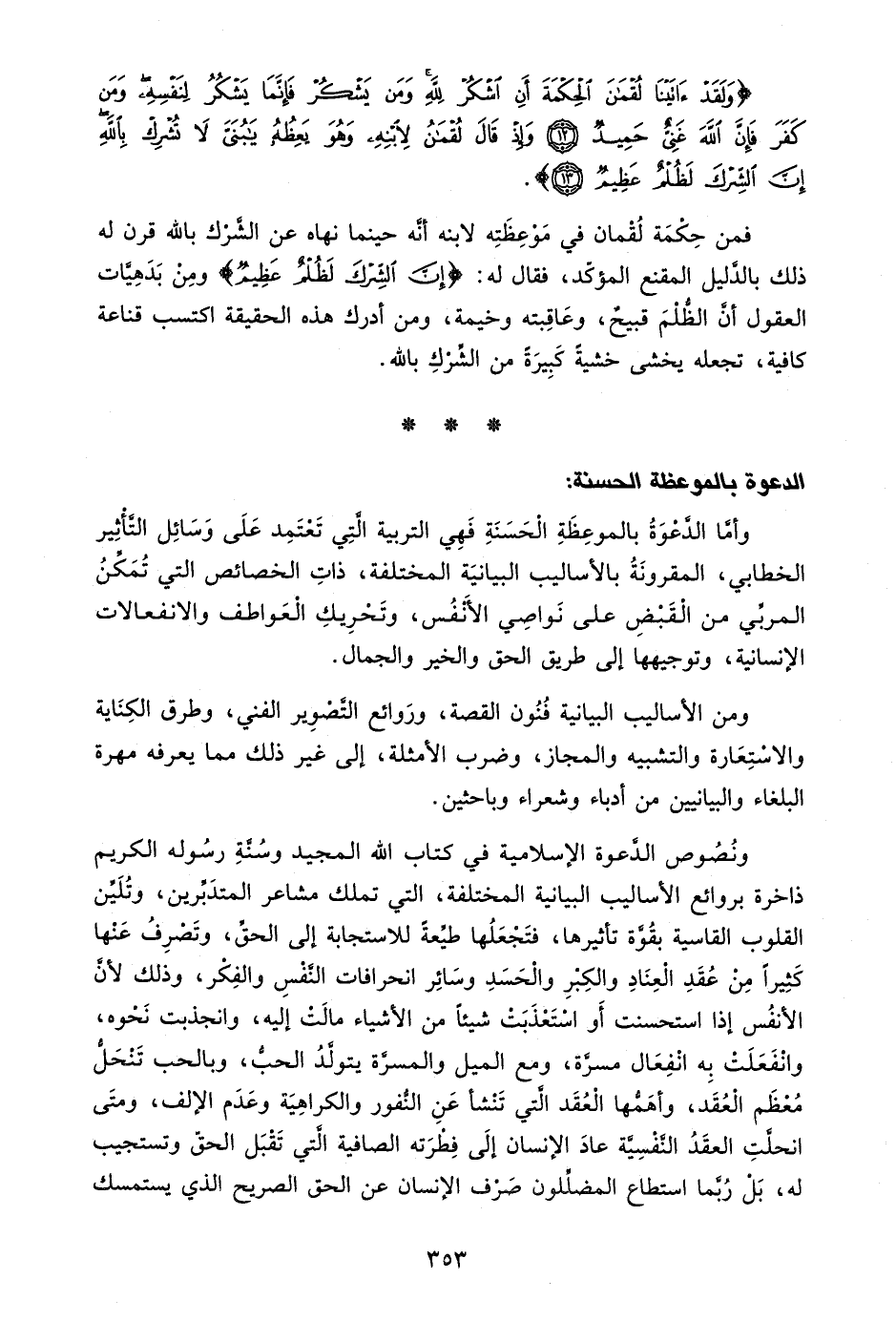 ونصوص الدعوة الإسلامية في كتاب الله المجيد وسنة رسوله الكريم ذاخرة بروائع الأساليب البيانية المختلفة، التي تملك مشاعر المتدبرين، وتلين القلوب القاسية بقوة تأثيرها، فتجعلها طيعة للاستجابة إلى الحق، وتصرف عنها كثيرًا من عقد العناد والكبر والحسد وسائر انحرافات النفس والفكر، وذلك لأن الأنفس إذا استحسنت أو استعذبت شيئًا من الأشياء مالت إليه، وانجذبت نحوه، وانفعلت به انفعال مسرة، ومع الميل والمسرة يتولد الحب، وبالحب تنحل معظم العقد، وأهمها العقد التي تنشأ عن النفور والكراهية وعدم الإلف، ومتى انحلت العقد النفسية عاد الإنسان إلى فطرته الصافية التي تقبل الحق وتستجيب له، بل ربما استطاع المضللون صرف الإنسان عن الحق الصريح الذي يستمسك