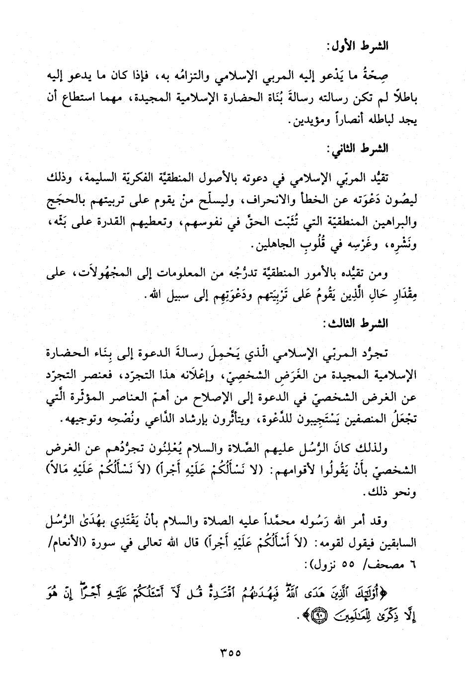 صحة ما يدعو إليه المربي الإسلامي والتزامه به، فإذا كان ما يدعو إليه باطلًا لم تكن رسالته رسالة بناة الحضارة الإسلامية المجيدة، مهما استطاع أن يجد لباطله أنصارًا ومؤيدين.