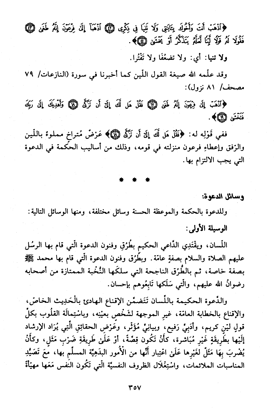 اللسان، ويقتدي الداعي الحكيم بطرق وفنون الدعوة التي قام بها الرسل عليهم الصلاة والسلام بصفة عامة, وبطرق وفنون الدعوة التي قام بها محمد صلى الله عليه وسلم بصفة خاصة، ثم بالطرق الناجحة التي سلكها النخبة الممتازة من أصحابه رضوان الله عليهم، والتي سلكها تابعوهم بإحسان.