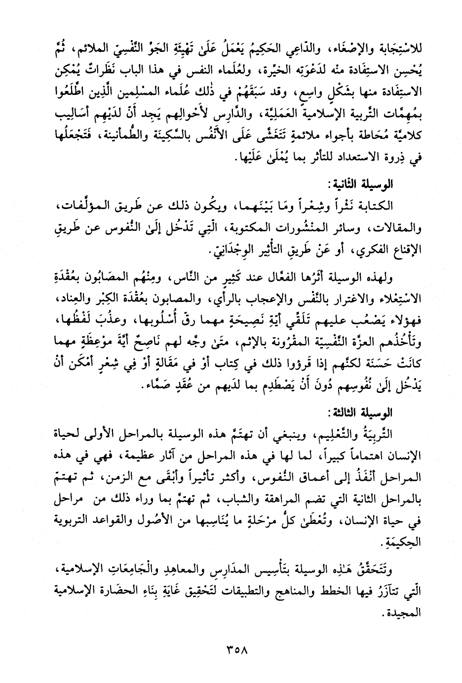 التربية والتعليم، وينبغي أن تهتم هذه الوسيلة بالمراحل الأولى لحياة الإنسان اهتمامًا كبيرًا، لما لها في هذه المراحل من آثار عظيمة، فهي في هذه المراحل أنفذ إلى أعماق النفوس، وأكثر تأثيرًا وأبقى مع الزمن، ثم تهتم بالمراحل الثانية التي تضم المراهقة والشباب، ثم تهتم بما وراء ذلك من مراحل في حياة الإنسان، وتغطي كل مرحلة ما يناسبها من الأصول والقواعد التربوية الحكيمة.