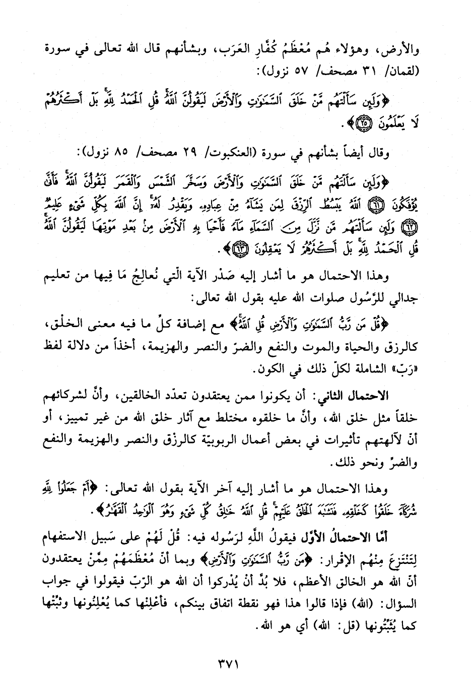 {وَلَئِنْ سَأَلْتَهُمْ مَنْ خَلَقَ السَّمَاوَاتِ وَالْأَرْضَ وَسَخَّرَ الشَّمْسَ وَالْقَمَرَ لَيَقُولُنَّ اللَّهُ فَأَنَّى يُؤْفَكُونَ، اللَّهُ يَبْسُطُ الرِّزْقَ لِمَنْ يَشَاءُ مِنْ عِبَادِهِ وَيَقْدِرُ لَهُ إِنَّ اللَّهَ بِكُلِّ شَيْءٍ عَلِيمٌ، وَلَئِنْ سَأَلْتَهُمْ مَنْ نَزَّلَ مِنَ السَّمَاءِ مَاءً فَأَحْيَا بِهِ الْأَرْضَ مِنْ بَعْدِ مَوْتِهَا لَيَقُولُنَّ اللَّهُ قُلِ الْحَمْدُ لِلَّهِ بَلْ أَكْثَرُهُمْ لَا يَعْقِلُونَ} .