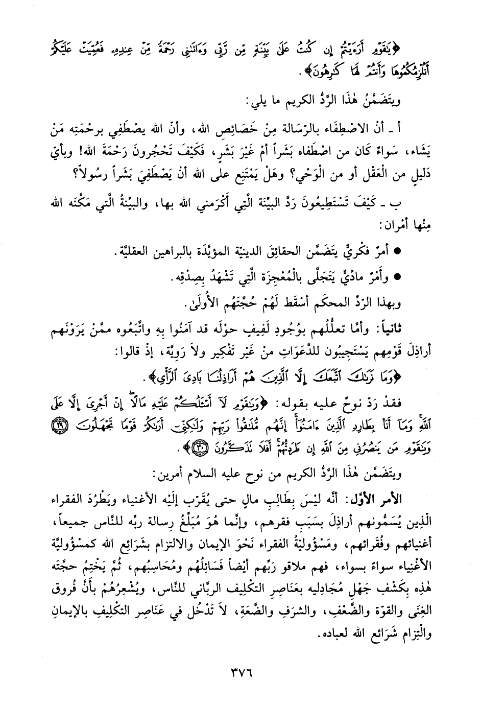 الأمر الأول: إنه ليس بطالب مال حتى يقرب إليه الأغنياء ويطرد الفقراء الذين يسمونهم أراذل بسبب فقرهم، وإنما هو مبلغ رسالة ربه للناس جميعًا أغنيائهم وفقرائهم، ومسئولية الفقراء نحو الإيمان والالتزام بشرائع الله كمسئولية الأغنياء سواء بسواء، فهم ملاقو ربهم أيضًا فسائلهم ومحاسبهم، ثم يختم حجته هذه بكشف جهل مجادليه بعناصر التكليف الرباني للناس، ويشعرهم بأن فروق الغنى والقوة والضعف، والشرف والضعة، لا تدخل في عناصر التكليف بالإيمان والتزام شرائع الله لعباده.