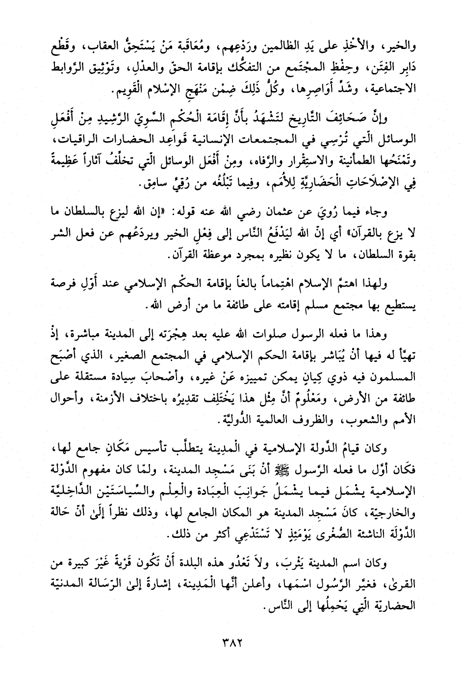 وهذا ما فعله الرسول صلوات الله عليه بعد هجرته إلى المدينة مباشرة؛ إذ تهيأ له فيها أن يباشرها بإقامة الحكم الإسلامي في المجتمع الصغير، الذي أصبح المسلمون فيه ذوي كيان يمكن تمييزه عن غيره، وأصحاب سيادة مستقلة على طائفة من الأرض، ومعلوم أن مثل هذا يختلف تقديره باختلاف الأزمنة، وأحوال الأمم والشعوب، والظروف العالمية الدولية.