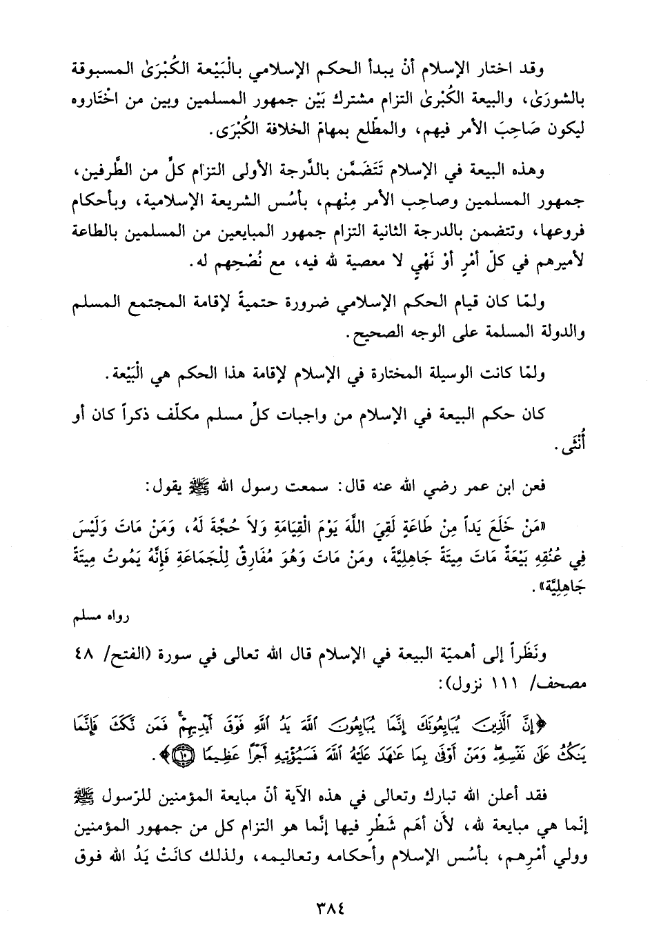 ولما كانت الوسيلة المختارة في الإسلام لإقامة هذا الحكم هي البيعة.