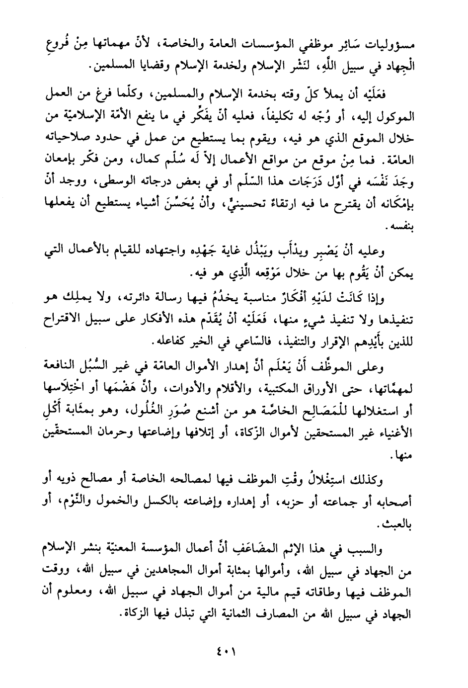 مسئوليات سائر موظفي المؤسسات العامة والخاصة؛ لأن مهماتها من فروع الجهاد في سبيل الله، لنشر الإسلام ولخدمة الإسلام وقضايا المسلمين.