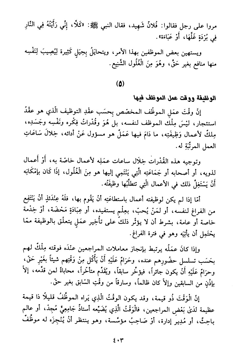 إن وقت عمل الموظف المخصص بحسب عقد التوظيف الذي هو عقد استئجار، ليس ملك الموظف لنفسه، بل هو وقدرات فكره ونفسه وجسده، ملك لأعمال وظيفته، ما دام فيها عمل هو مسئول عن أدائه، خلال ساعات العمل المرتبة له.