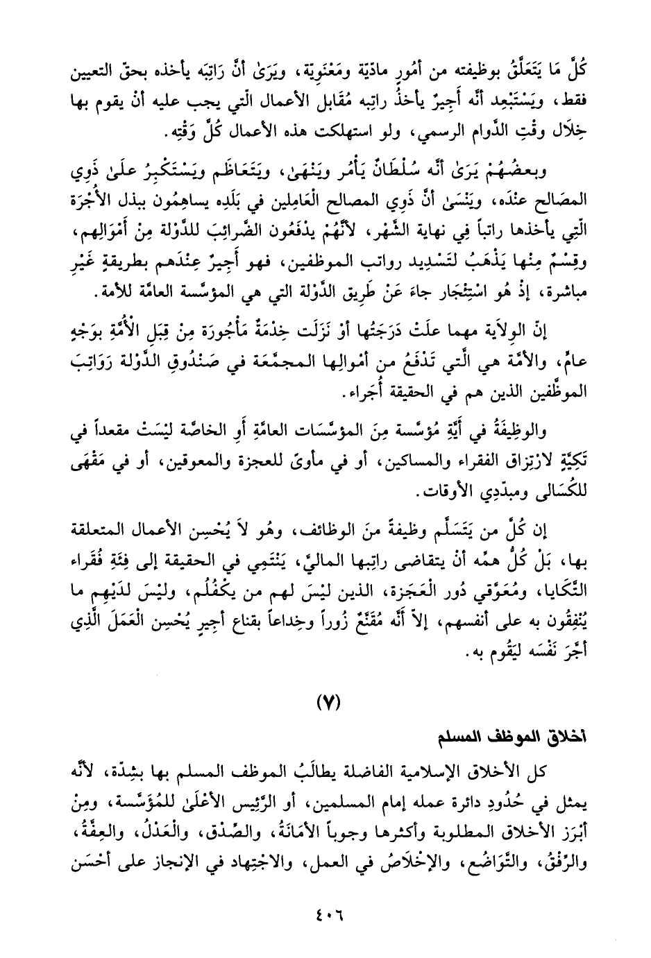 إن الولاية مهما علت درجتها أو نزلت خدمة مأجورة من قبل الأمة بوجه عام، والأمة هي التي تدفع من أموالها المجمعة في صندوق الدولة رواتب الموظفين الذين هم في الحقيقة أجراء.