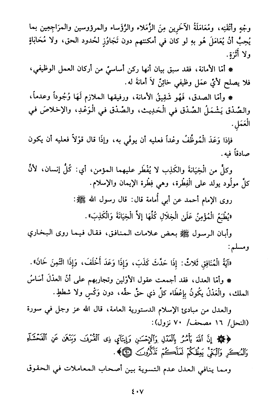 والعدل من مبادئ الإسلام الدستورية العامة، قال الله عز وجل في سورة "النحل: 16 مصحف/ 70 نزول":