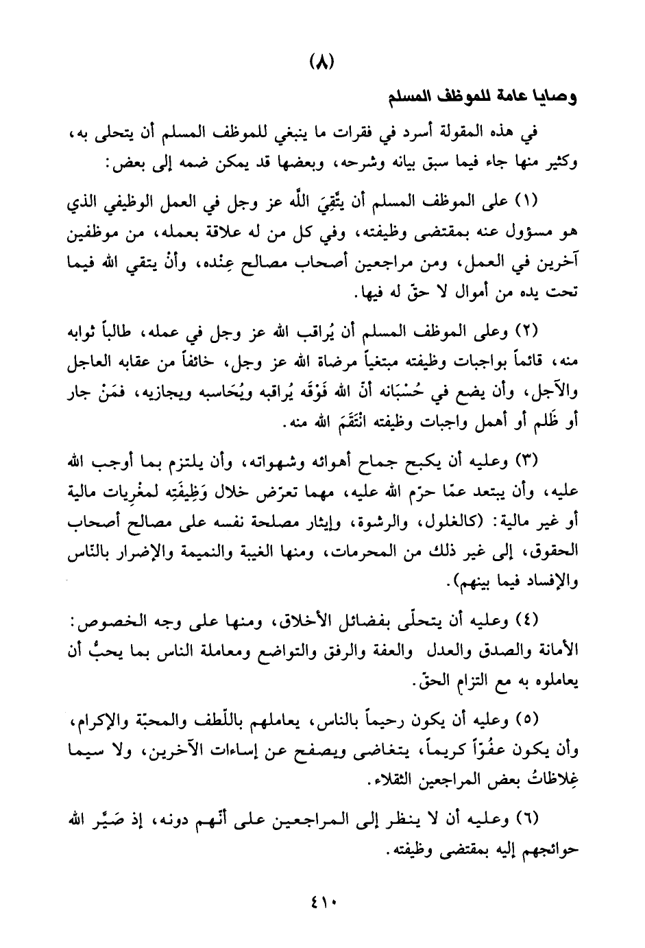 في هذه المقولة أسرد في فقرات ما ينبغي للموظف المسلم أن يتحلى به، وكثير منها جاء فيما سبق بيانه وشرحه، وبعضها قد يمكن ضمه إلى بعض: