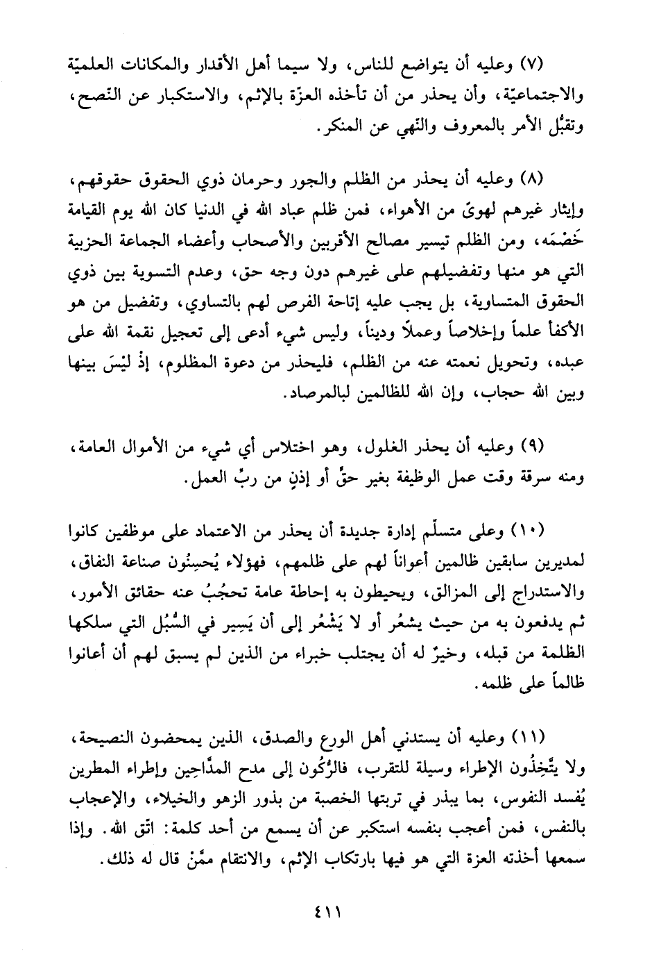 10- وعلى متسلم إدارة جديدة أن يحذر من الاعتماد على موظفين كانوا لمديرين سابقين ظالمين أعوانًا لهم على ظلمهم، فهؤلاء يحسنون صناعة النفاق، والاستدارج إلى المزالق، ويحيطون به إحاطة عامة تحجب عنه حقائق الأمور، ثم يدفعون به من حيث يشعر أو لا يشعر إلى أن يسير في السبل التي سلكها الظلمة من قبله، وخير له أن يجتلب خبراء من الذين لم يسبق لهم أن أعانوا ظالمًا على ظلمه.