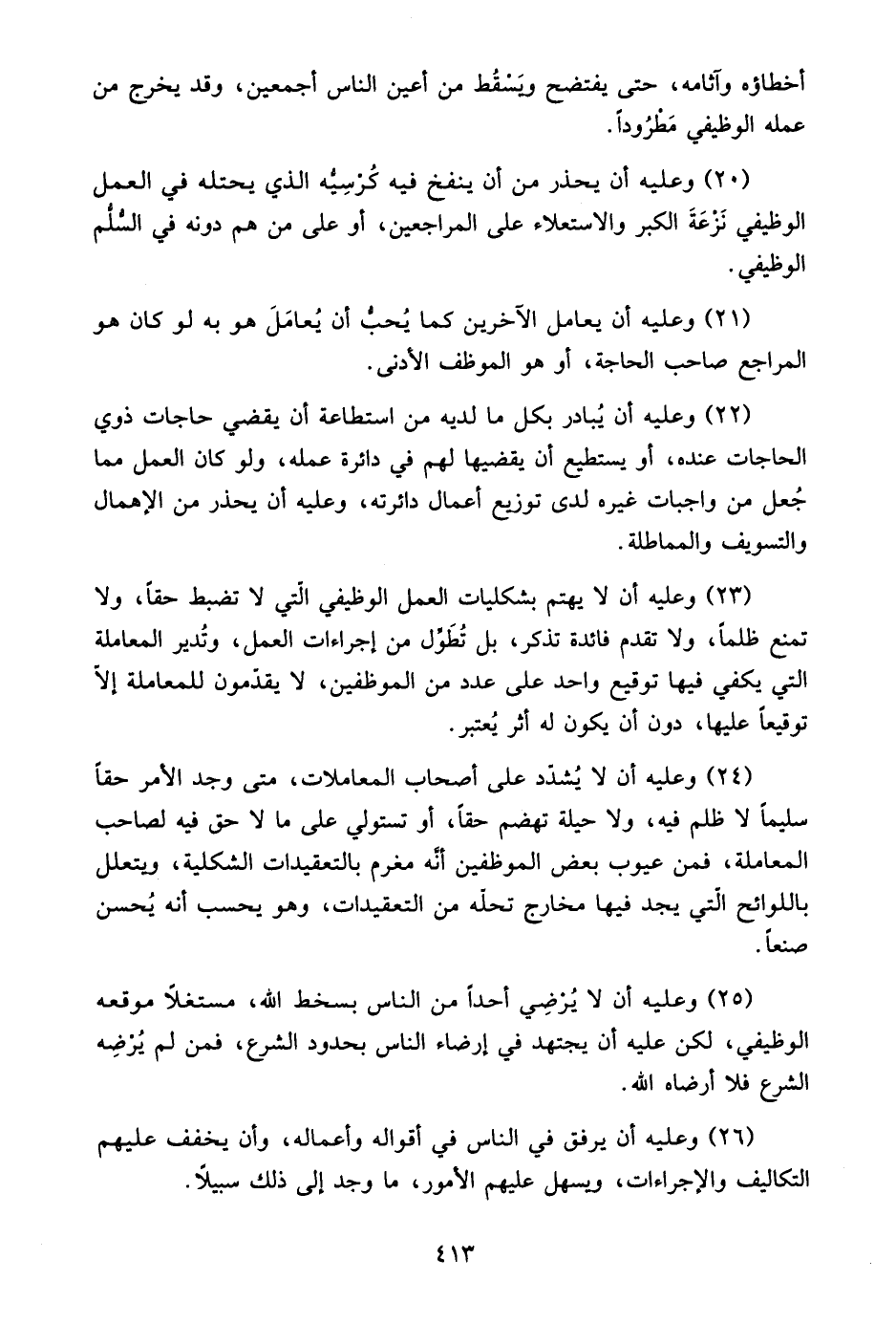 23- وعليه أن لا يتهم بشكليات العمل الوظيفي التي لا تضبط حقًّا، ولا تمنع ظلمًا، ولا تقدم فائدة تذكر، بل تطول من إجراءات العمل، وتدير المعاملة التي يكفي فيها توقيع واحد على عدد من الموظفين، لا يقدمون للمعاملة إلا توقيعًا عليها، دون أن يكون له أثر يعتبر.