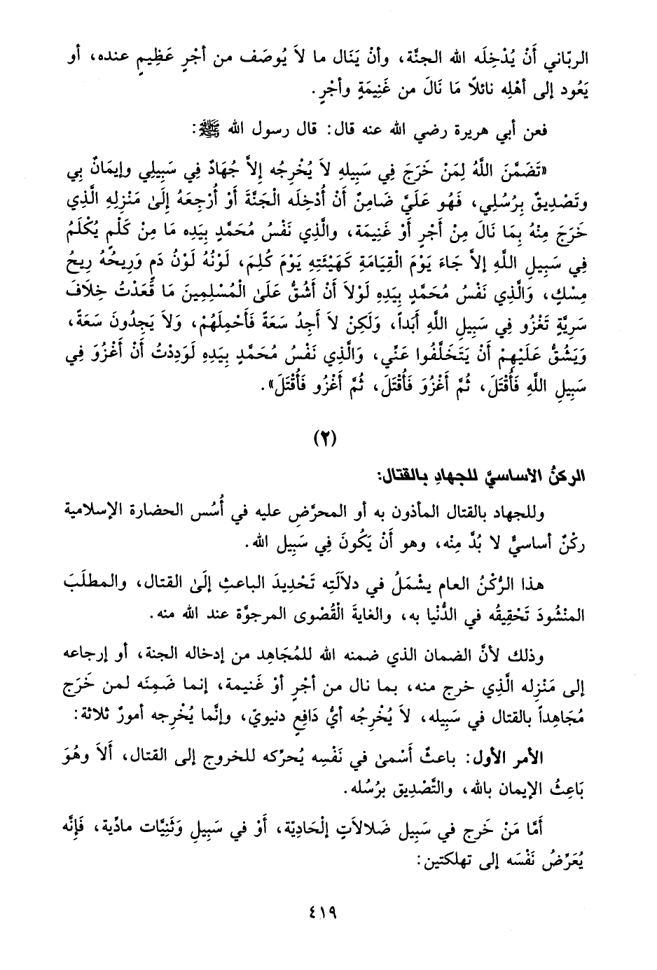 "تضمن الله لمن خرج في سبيله لا يخرجه إلا جهاد في سبيلي وإيمان بي وتصديق برسلي، فهو عليَّ ضامن أن أدخله الجنة أو أرجعه إلى منزله الذي خرج منه بما نال من أجر أو غنيمة، والذي نفس محمد بيده ما من كلم يكلم في سبيل الله إلا جاء يوم القيامة كهيئته يوم كلم، لونه لون دم وريحه ريح مسك، والذي نفس محمد بيده لولا أن أشق على المسلمين، ما قعدت خلاف سرية تغزو في سبيل الله أبدًا، ولكن لا أجد سعة فأحملهم، ولا يجدون سعة، ويشق عليهم أن يتخلفوا عني، والذي نفس محمد بيده لوددت أن أغزو في سبيل الله فأقتل، ثم أغزو فأقتل، ثم أغزو فأقتل".