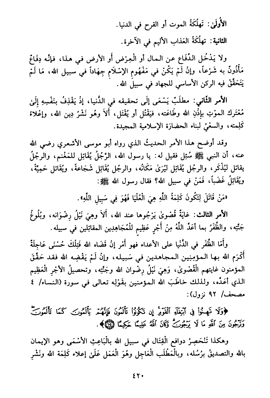 وقد أوضح هذا الأمر الحديث الذي رواه أبو موسى الأشعري رضي الله عنه، أن النبي صلى الله عليه وسلم سئل فقيل له: يا رسول الله، الرجل يقاتل للمغنم، والرجل يقاتل ليذكر، والرجل يقاتل ليرى مكانه، والرجل يقاتل لشجاعة، ويقاتل حمية، ويقاتل غضبًا، فمن في سبيل الله؟ فقال رسول الله صلى الله عليه وسلم: