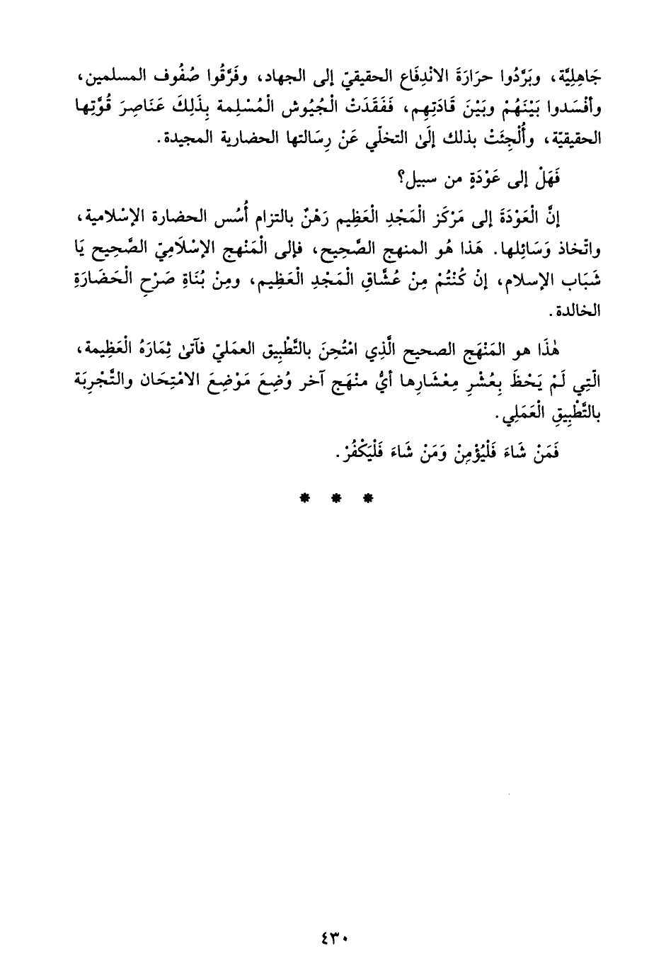 إن العودة إلى مركز المجد العظيم رهن بالتزام أسس الحضارة الإسلامية، واتخاذ وسائلها. هذا هو المنهج الصحيح، فإلى المنهج الإسلامي الصحيح يا شباب الإسلام، إن كنتم من عشاق المجد العظيم، ومن بناة صرح الحضارة الخالدة.