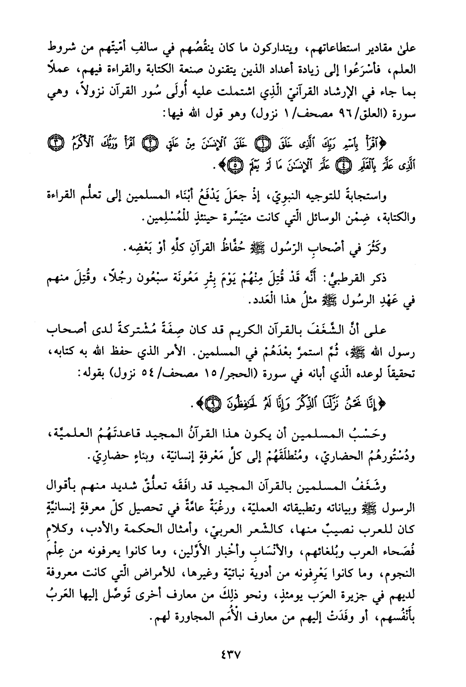 على مقادير استطاعاتهم, ويتداركون ما كان ينقصهم في سالف أميتهم من شروط العلم، فأسرعوا إلى زيادة أعداء الذين يتقنون صنعة الكتابة والقراءة فيهم، عملًا بما جاء في الإرشاد القرآني الذي اشتملت عليه أولى سور القرآن نزولًا، وهي سورة "العلق: 96 مصحف/ 1 نزول" وهو قول الله فيها: