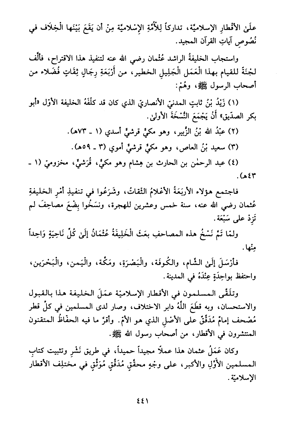 واستجاب الخليفة الراشد عثمان رضي الله عنه لتنفيذ هذا الاقتراح، فألف لجنة للقيام بهذا العمل الجليل الخطير، من أربعة رجال ثقات فضلاء من أصحاب الرسول صلى الله عليه وسلم، وهم:
