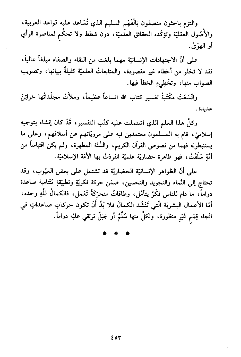 على أن الظواهر الإنسانية الحضارية قد تشتمل على بعض العيوب، وقد تحتاج إلى النماء والتجويد والتحسين، ضمن حركة فكرية وتطبيقة متنامية صاعدة دوامًا، ما دام للناس فكر يتأمل، وطاقات متحركة تعمل، فالكمال لله وحده، أما الأعمال البشرية التي تنشد الكمال فلا بد أن تكون حركات صاعدات في اتجاه قمم غير منظورة، ولكل منها سلم أو جبل ترتقي عليه دوامًا.
